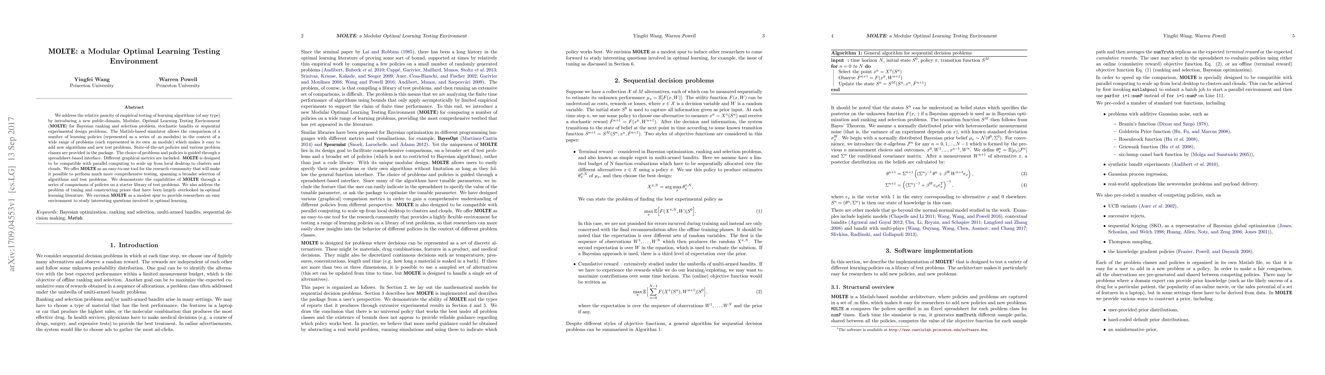 We address the relative paucity of empirical testing of learning algorithms (of any type) by introducing a new public-domain, Modular, Optimal Learning Testing Environment (MOLTE) for Bayesian ranking and selection problem, stochastic bandits or sequential experimental design problems. The Matlab-based simulator allows the comparison of a number of learning policies (represented as a series of .m modules) in the context of a wide range of problems (each represented in its own .m module) which makes it easy to add new algorithms and new test problems. State-of-the-art policies and various problem classes are provided in the package. The choice of problems and policies is guided through a spreadsheet-based interface. Different graphical metrics are included. MOLTE is designed to be compatible with parallel computing to scale up from local desktop to clusters and clouds. We offer MOLTE as an easy-to-use tool for the research community that will make it possible to perform much more comprehensive testing, spanning a broader selection of algorithms and test problems. We demonstrate the capabilities of MOLTE through a series of comparisons of policies on a starter library of test problems. We also address the problem of tuning and constructing priors that have been largely overlooked in optimal learning literature. We envision MOLTE as a modest spur to provide researchers an easy environment to study interesting questions involved in optimal learning.