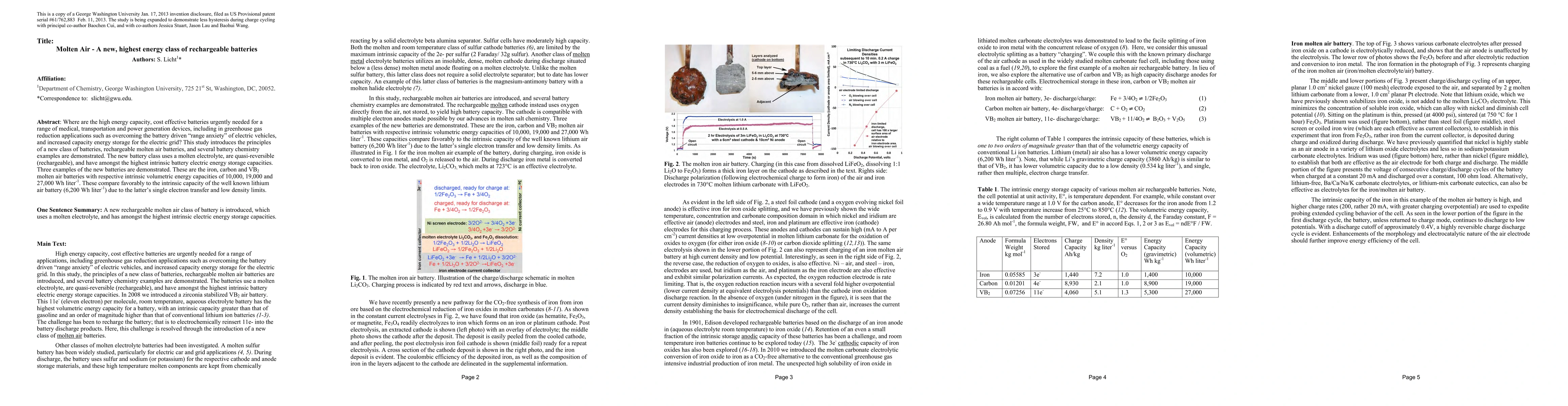 This study introduces the principles of a new class of batteries, rechargeable molten air batteries, and several battery chemistry examples are demonstrated. The new battery class uses a molten electrolyte, are quasi reversible, and have amongst the highest intrinsic battery electric energy storage capacities. Three examples of the new batteries are demonstrated. These are the iron, carbon and VB2 molten air batteries with respective intrinsic volumetric energy capacities of 10,000, 19,000 and 27,000 Wh per liter.
