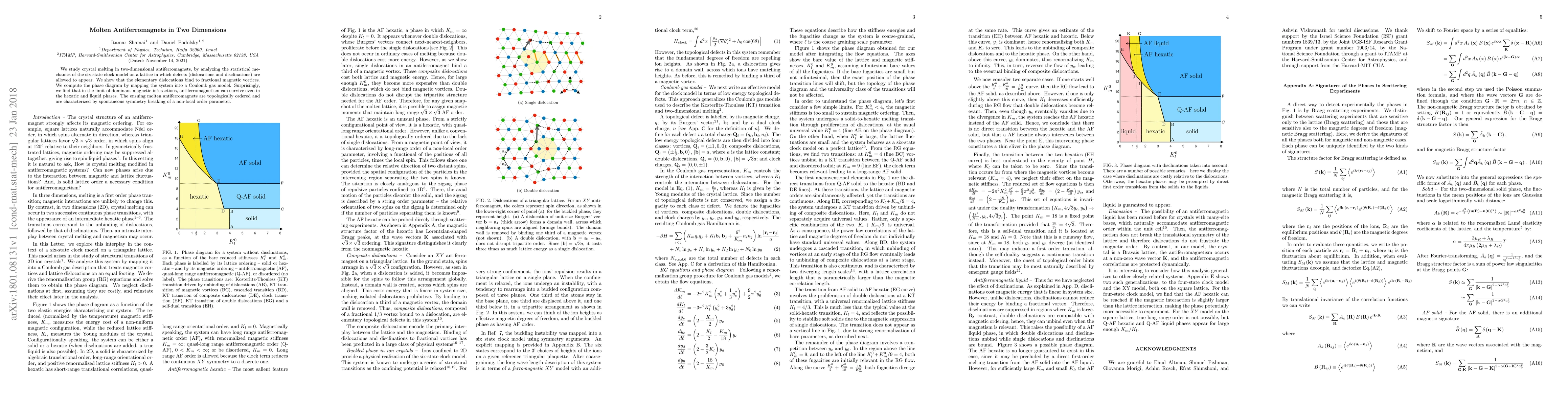 We study crystal melting in two-dimensional antiferromagnets, by analyzing the statistical mechanics of the six-state clock model on a lattice in which defects (dislocations and disclinations) are allowed to appear. We show that the elementary dislocations bind to fractional magnetic vortices. We compute the phase diagram by mapping the system into a Coulomb gas model. Surprisingly, we find that in the limit of dominant magnetic interactions, antiferromagnetism can survive even in the hexatic and liquid phases. The ensuing molten antiferromagnets are topologically ordered and are characterized by spontaneous symmetry breaking of a non-local order parameter.