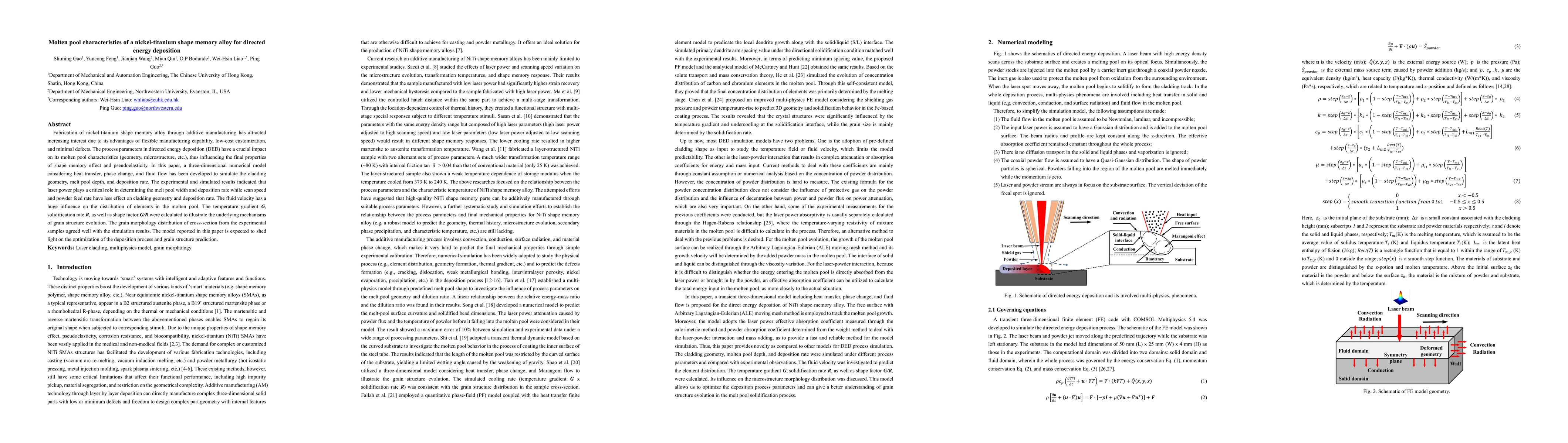 This paper develops a 3D numerical model to simulate the molten pool characteristics during directed energy deposition of nickel-titanium shape memory alloy, focusing on the effects of process parameters on melt pool geometry and microstructure. Experimental results confirm that laser power significantly influences melt pool width and deposition rate, while scan speed and powder feed rate have lesser effects.