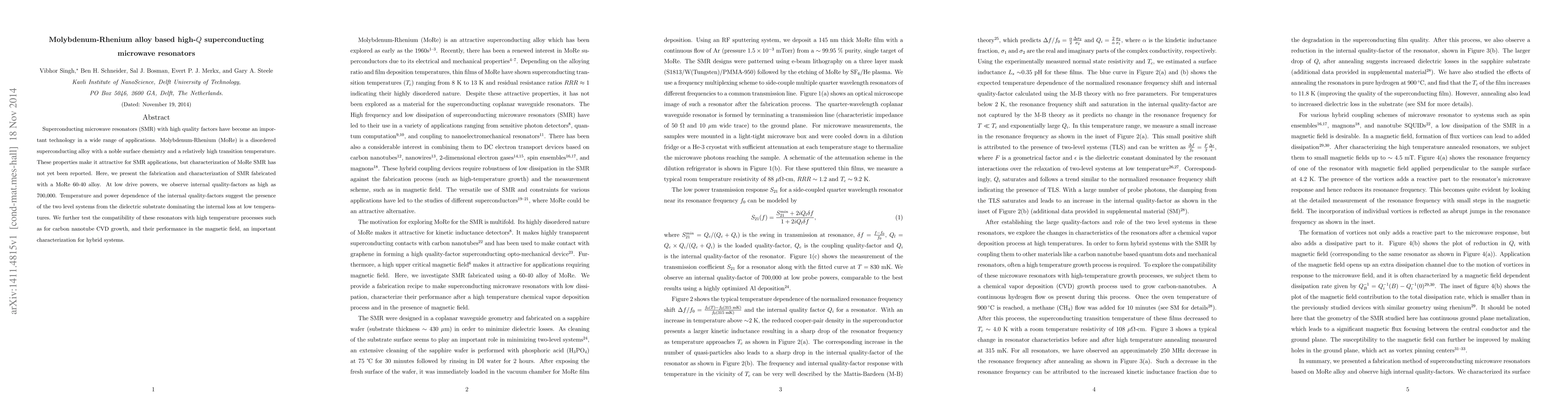 This paper reports the fabrication of MoRe 60-40 alloy-based superconducting microwave resonators (SMR) with high internal quality factors reaching up to 700,000 at low drive powers. The study also investigates the temperature and power dependence of these resonators, attributing low-temperature losses to two-level systems from the dielectric substrate.