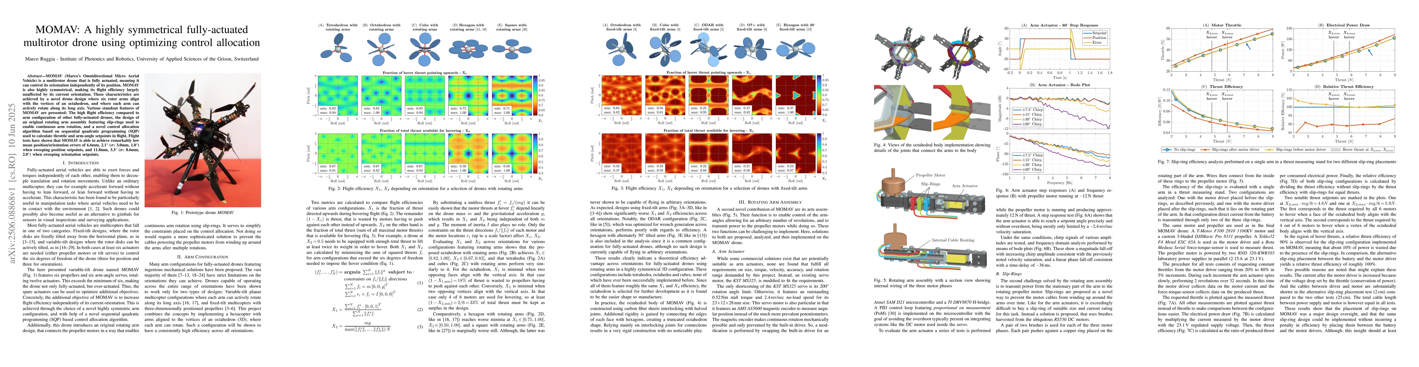 MOMAV is a fully-actuated multirotor drone with high flight efficiency and low mean position/orientation errors of 6.6mm and 2.1{°}, achieved through innovative design and optimization control allocation algorithm.