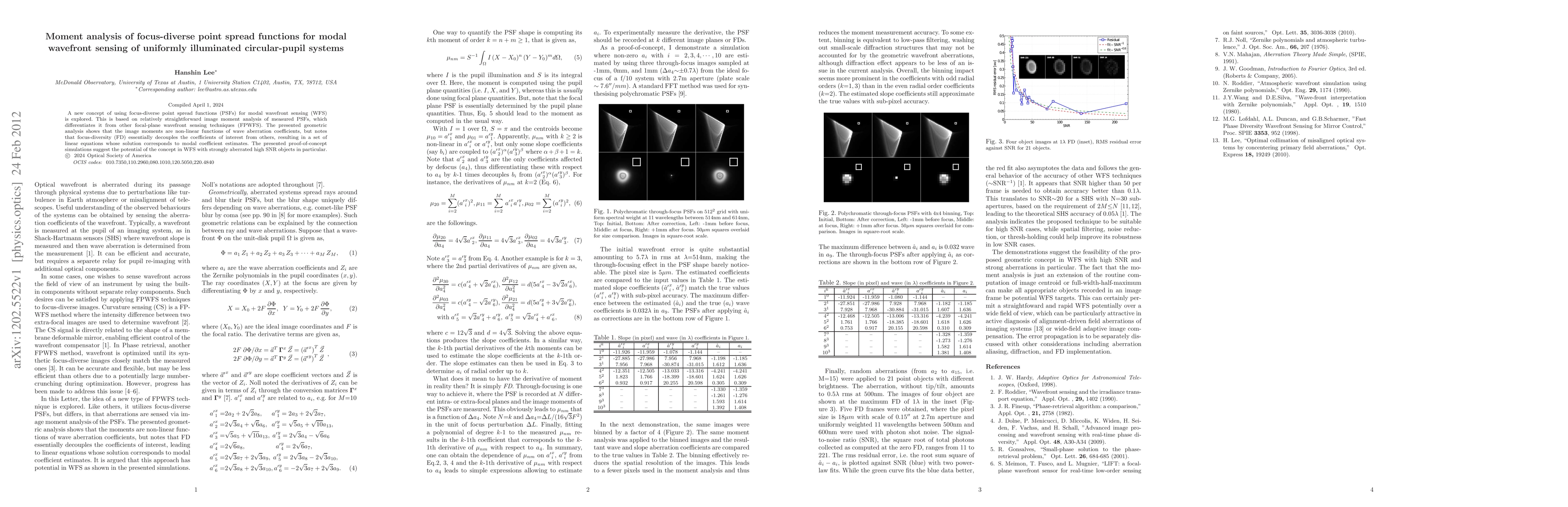 This paper explores a novel focus-diverse point spread function approach for modal wavefront sensing, utilizing image moment analysis to derive linear equations for estimating wave aberration coefficients. Simulation results indicate its potential effectiveness in high SNR, strongly aberrated systems.
