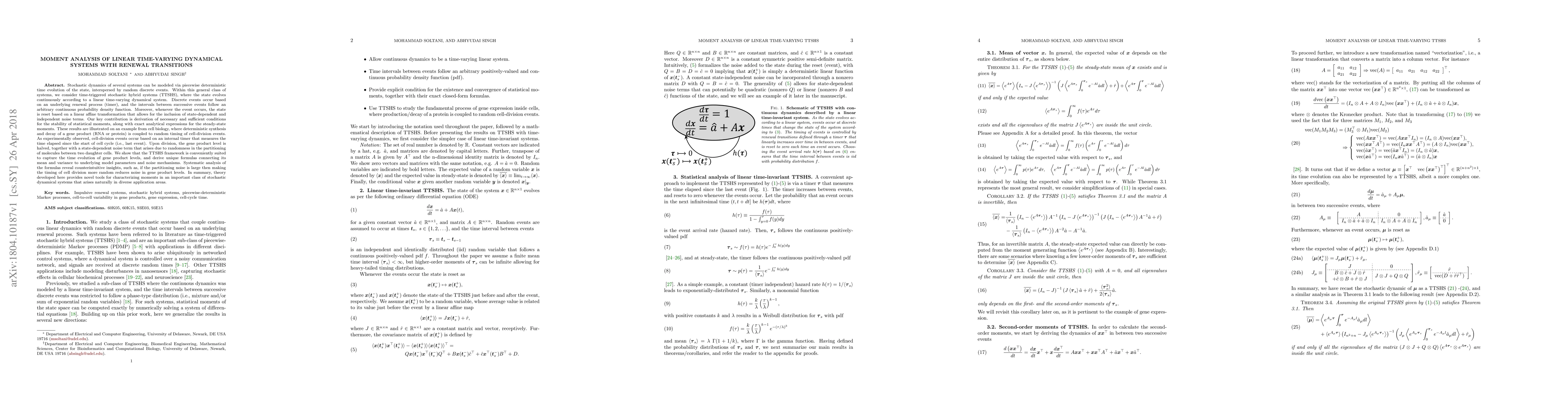 Stochastic dynamics of several systems can be modeled via piecewise deterministic time evolution of the state, interspersed by random discrete events. Within this general class of systems, we consider time-triggered stochastic hybrid systems (TTSHS), where the state evolves continuously according to a linear time-varying dynamical system. Discrete events occur based on an underlying renewal process (timer), and the intervals between successive events follow an arbitrary continuous probability density function. Moreover, whenever the event occurs, the state is reset based on a linear affine transformation that allows for the inclusion of state-dependent and independent noise terms. Our key contribution is derivation of necessary and sufficient conditions for the stability of statistical moments, along with exact analytical expressions for the steady-state moments. These results are illustrated on an example from cell biology, where deterministic synthesis and decay of a gene product (RNA or protein) is coupled to random timing of cell-division events. As experimentally observed, cell-division events occur based on an internal timer that measures the time elapsed since the start of cell cycle (i.e., last event). Upon division, the gene product level is halved, together with a state-dependent noise term that arises due to randomness in the partitioning of molecules between two daughter cells. We show that the TTSHS framework is conveniently suited to capture the time evolution of gene product levels, and derive unique formulas connecting its mean and variance to underlying model parameters and noise mechanisms. Systematic analysis of the formulas reveal counterintuitive insights, such as, if the partitioning noise is large then making the timing of cell division more random reduces noise in gene product levels.