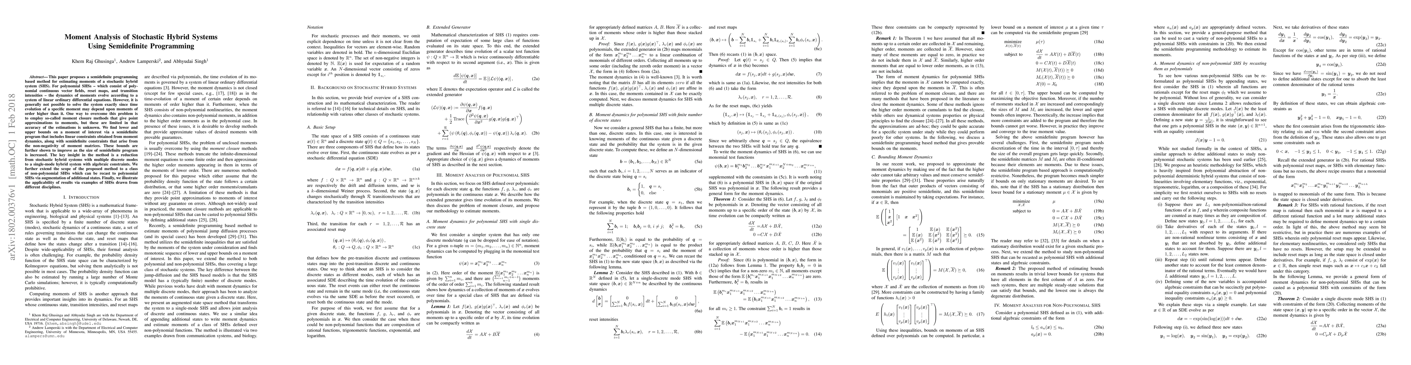 This paper introduces a semidefinite programming approach to estimate the moments of stochastic hybrid systems, providing lower and upper bounds that improve with larger programs. The method reduces complex systems to simpler forms and extends to non-polynomial systems through augmentation, demonstrating its applicability across various disciplines.