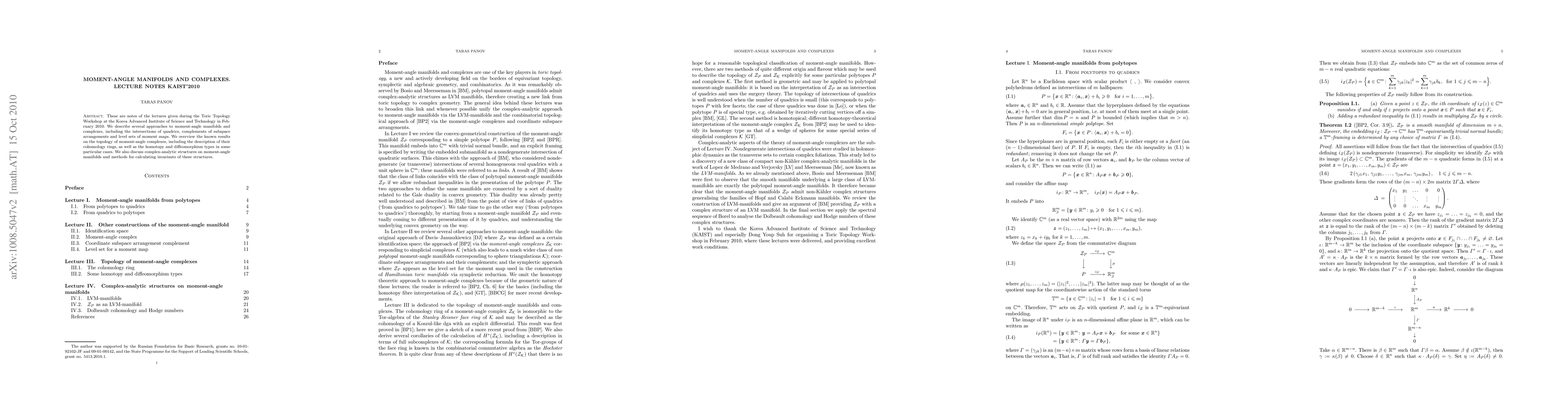 These lecture notes from the Toric Topology Workshop at KAIST 2010 explore various approaches to moment-angle manifolds and complexes, including their intersections with quadrics and complex-analytic structures. They review known results on their topology, cohomology rings, and homotopy types.
