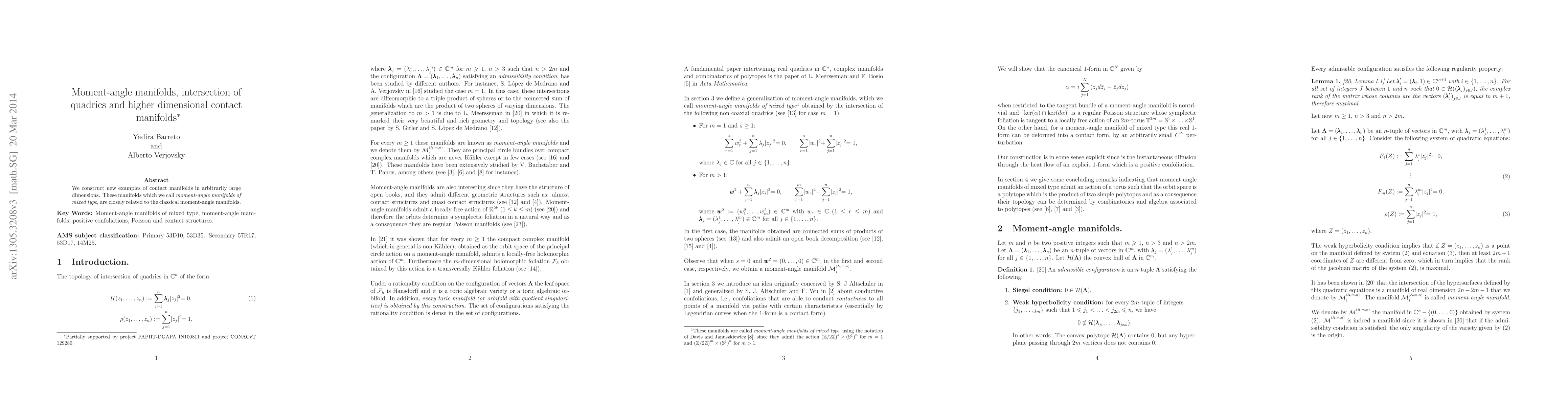 Summary: This paper constructs quasi moment-angle manifolds as new examples of higher-dimensional contact manifolds, establishing a close relationship with classical moment-angle manifolds. These manifolds provide insight into the intersection of quadrics and the structure of contact geometry in large dimensions.