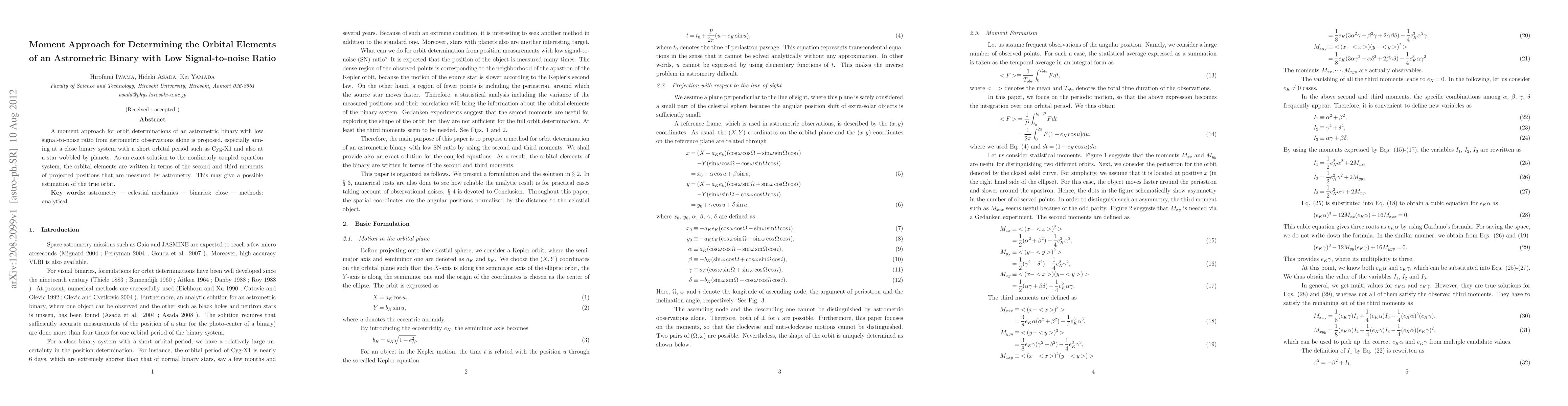 The paper introduces a moment approach to determine orbital elements of astrometric binaries with low signal-to-noise ratios. It presents an exact solution using second and third moments of projected positions, applicable to close binaries like Cyg-X1 and stars affected by planets, offering a potential estimation of true orbits.