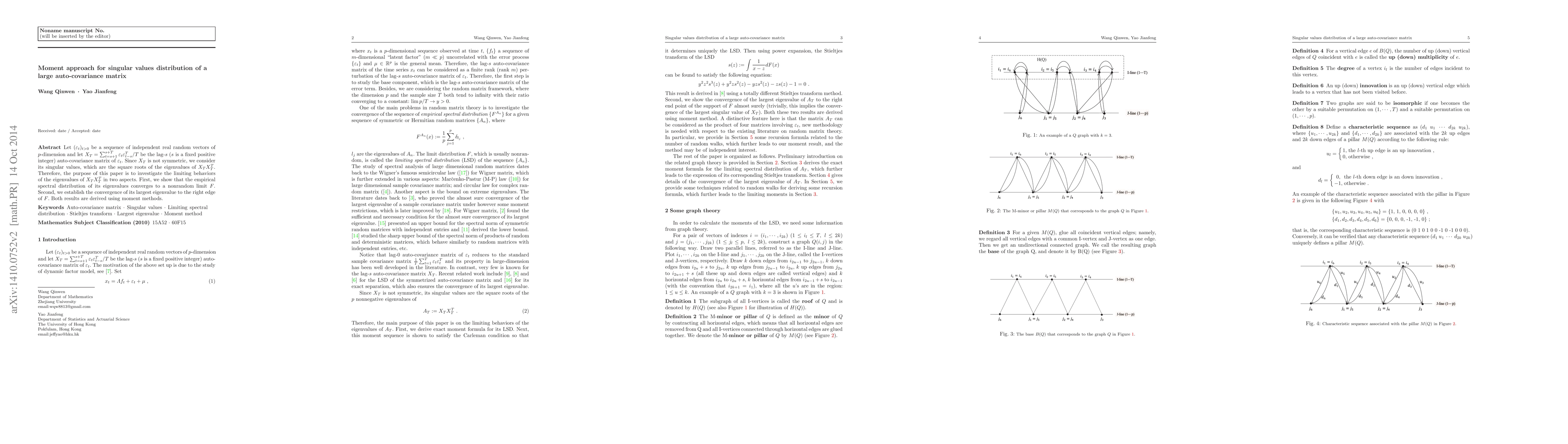 Let $(\varepsilon_{t})_{t>0}$ be a sequence of independent real random vectors of $p$-dimension and let $X_T= \sum_{t=s+1}^{s+T}\varepsilon_t\varepsilon^T_{t-s}/T$ be the lag-$s$ ($s$ is a fixed positive integer) auto-covariance matrix of $\varepsilon_t$. Since $X_T$ is not symmetric, we consider its singular values, which are the square roots of the eigenvalues of $X_TX^T_T$. Therefore, the purpose of this paper is to investigate the limiting behaviors of the eigenvalues of $X_TX^T_T$ in two aspects. First, we show that the empirical spectral distribution of its eigenvalues converges to a nonrandom limit $F$. Second, we establish the convergence of its largest eigenvalue to the right edge of $F$. Both results are derived using moment methods.