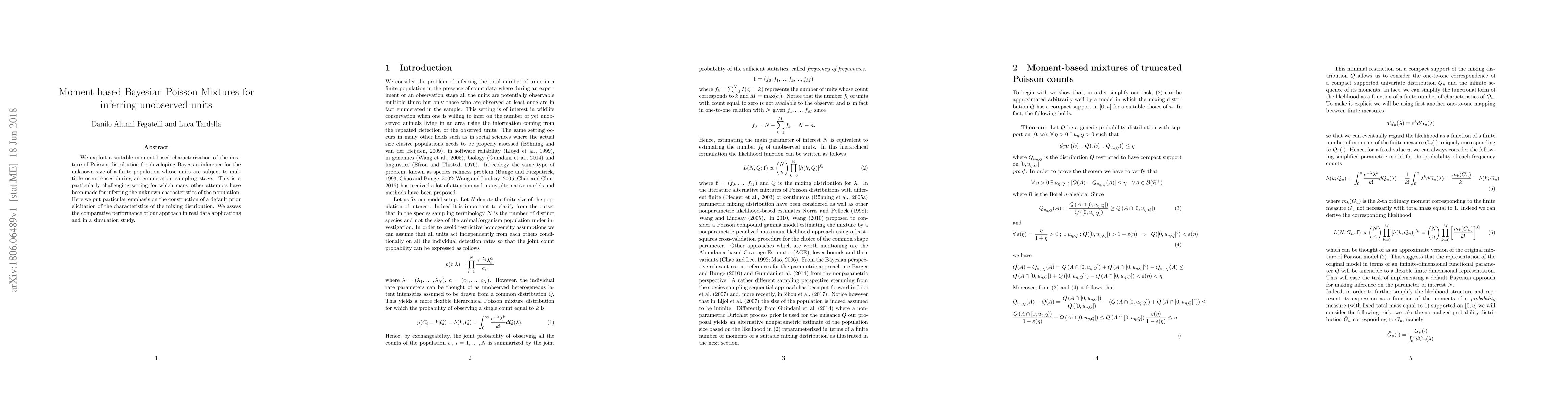We exploit a suitable moment-based characterization of the mixture of Poisson distribution for developing Bayesian inference for the unknown size of a finite population whose units are subject to multiple occurrences during an enumeration sampling stage. This is a particularly challenging setting for which many other attempts have been made for inferring the unknown characteristics of the population. Here we put particular emphasis on the construction of a default prior elicitation of the characteristics of the mixing distribution. We assess the comparative performance of our approach in real data applications and in a simulation study.