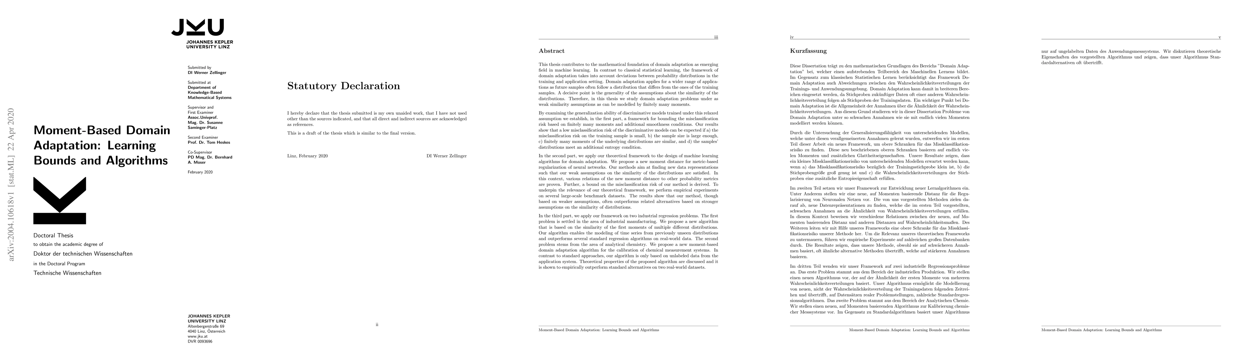 This thesis contributes to the mathematical foundation of domain adaptation as emerging field in machine learning. In contrast to classical statistical learning, the framework of domain adaptation takes into account deviations between probability distributions in the training and application setting. Domain adaptation applies for a wider range of applications as future samples often follow a distribution that differs from the ones of the training samples. A decisive point is the generality of the assumptions about the similarity of the distributions. Therefore, in this thesis we study domain adaptation problems under as weak similarity assumptions as can be modelled by finitely many moments.