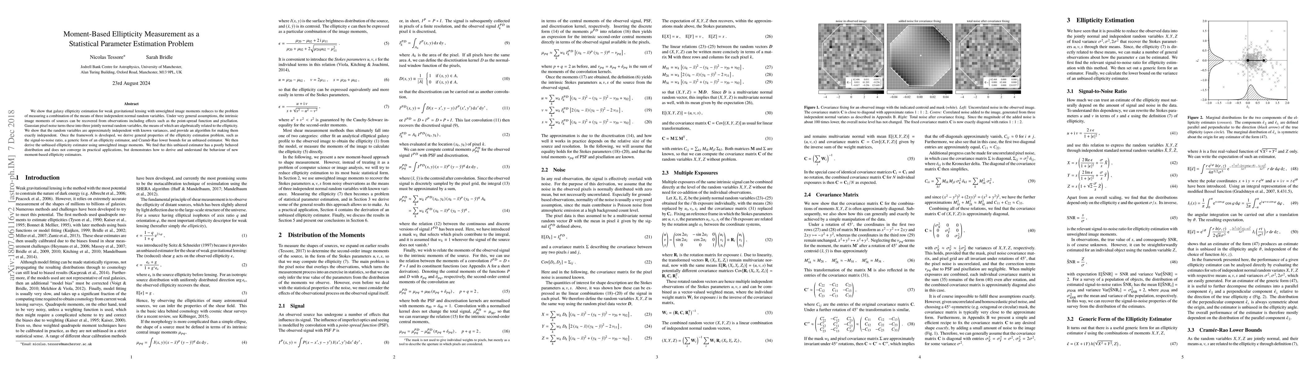 This paper develops a statistical framework for estimating galaxy ellipticity in weak gravitational lensing using unweighted image moments, showing it reduces to measuring means of three independent normal random variables. It provides an algorithm to make these variables exactly independent and derives properties like signal-to-noise ratio and Cramér-Rao lower bounds, concluding that while an unbiased estimator exists, it does not perform well in practical applications.