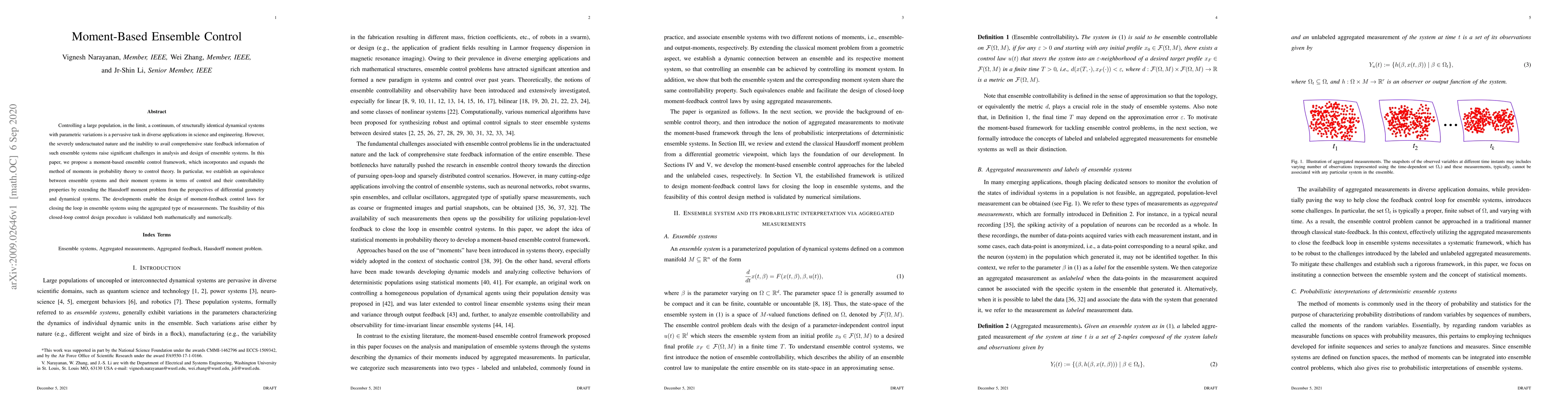 This paper proposes a moment-based ensemble control framework to manage large populations of structurally identical dynamical systems with parametric variations. It establishes an equivalence between ensemble systems and their moment systems, enabling the design of moment-feedback control laws using aggregated measurements, validated through both mathematical and numerical methods.