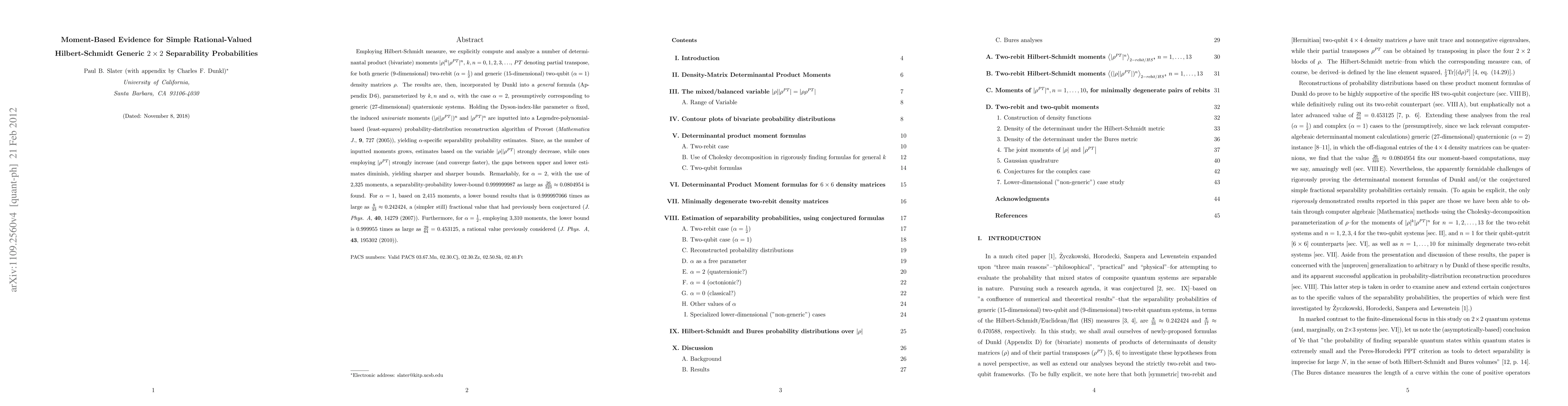 Employing Hilbert-Schmidt measure, we explicitly compute and analyze a number of determinantal product (bivariate) moments |rho|^k |rho^{PT}|^n, k,n=0,1,2,3,..., PT denoting partial transpose, for both generic (9-dimensional) two-rebit (alpha = 1/2) and generic (15-dimensional) two-qubit (alpha=1) density matrices rho. The results are, then, incorporated by Dunkl into a general formula (Appendix D6), parameterized by k, n and alpha, with the case alpha=2, presumptively corresponding to generic (27-dimensional) quaternionic systems. Holding the Dyson-index-like parameter alpha fixed, the induced univariate moments (|rho| |rho^{PT}|)^n and |rho^{PT}|^n are inputted into a Legendre-polynomial-based (least-squares) probability-distribution reconstruction algorithm of Provost (Mathematica J., 9, 727 (2005)), yielding alpha-specific separability probability estimates. Since, as the number of inputted moments grows, estimates based on |rho| |rho^{PT}| strongly decrease, while ones employing |rho^{PT}| strongly increase (and converge faster), the gaps between upper and lower estimates diminish, yielding sharper and sharper bounds. Remarkably, for alpha = 2, with the use of 2,325 moments, a separability-probability lower-bound 0.999999987 as large as 26/323 = 0.0804954 is found. For alpha=1, based on 2,415 moments, a lower bound results that is 0.999997066 times as large as 8/33 = 0.242424, a (simpler still) fractional value that had previously been conjectured (J. Phys. A, 40, 14279 (2007)). Furthermore, for alpha = 1/2, employing 3,310 moments, the lower bound is 0.999955 times as large as 29/64 = 0.453125, a rational value previously considered (J. Phys. A, 43, 195302 (2010)).