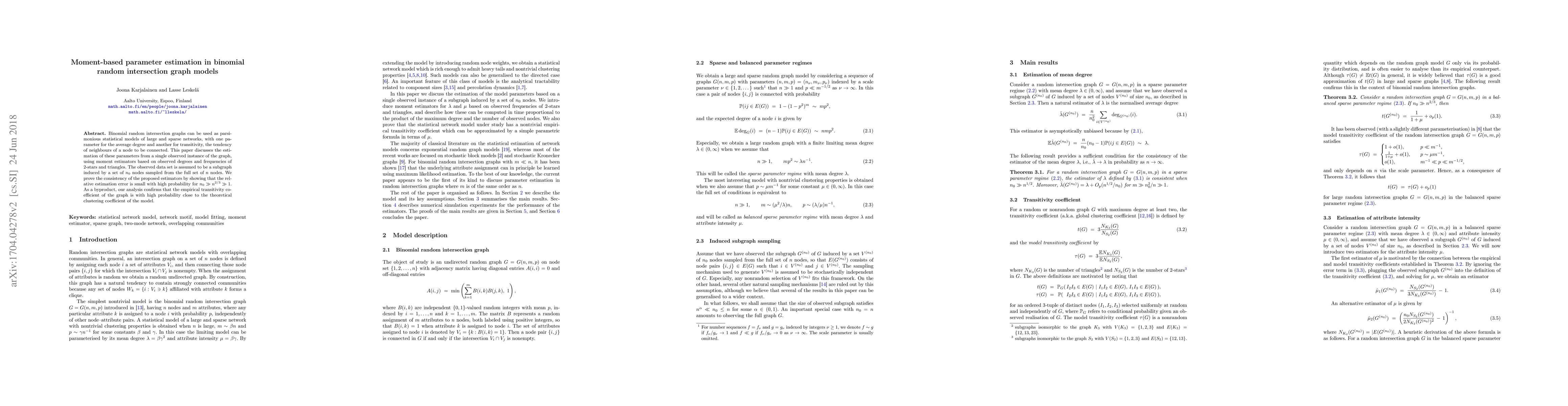 This paper proposes moment-based estimators for parameters in binomial random intersection graph models, focusing on average degree and transitivity. It demonstrates the consistency of these estimators using observed subgraphs, proving that the relative estimation error is small with high probability when the sample size is sufficiently large relative to the network size.