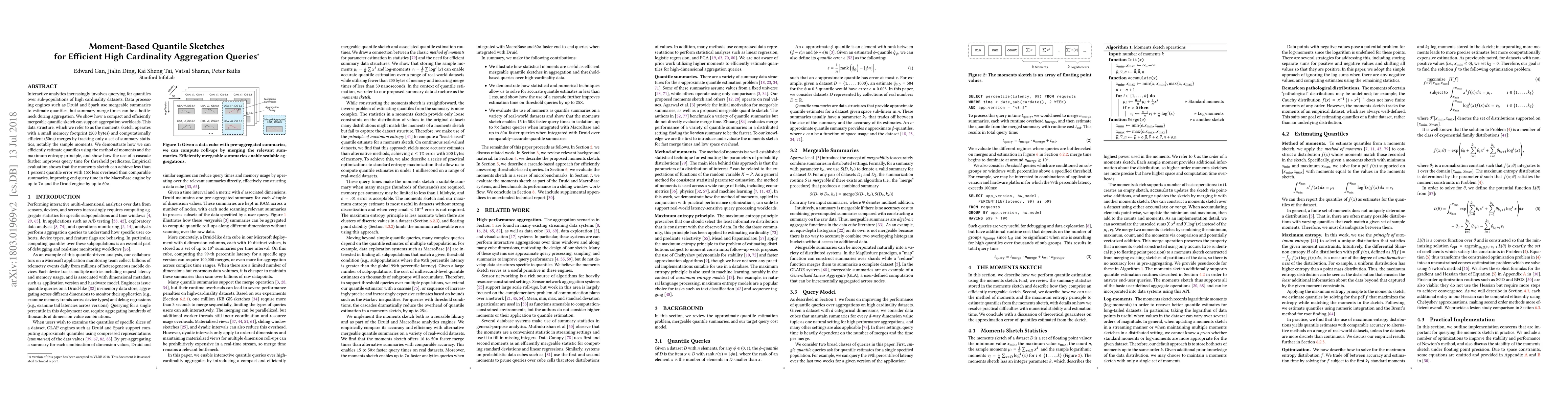 Interactive analytics increasingly involves querying for quantiles over sub-populations of high cardinality datasets. Data processing engines such as Druid and Spark use mergeable summaries to estimate quantiles, but summary merge times can be a bottleneck during aggregation. We show how a compact and efficiently mergeable quantile sketch can support aggregation workloads. This data structure, which we refer to as the moments sketch, operates with a small memory footprint (200 bytes) and computationally efficient (50ns) merges by tracking only a set of summary statistics, notably the sample moments. We demonstrate how we can efficiently and practically estimate quantiles using the method of moments and the maximum entropy principle, and show how the use of a cascade further improves query time for threshold predicates. Empirical evaluation on real-world datasets shows that the moments sketch can achieve less than 1 percent error with 15 times less merge overhead than comparable summaries, improving end query time in the MacroBase engine by up to 7 times and the Druid engine by up to 60 times.