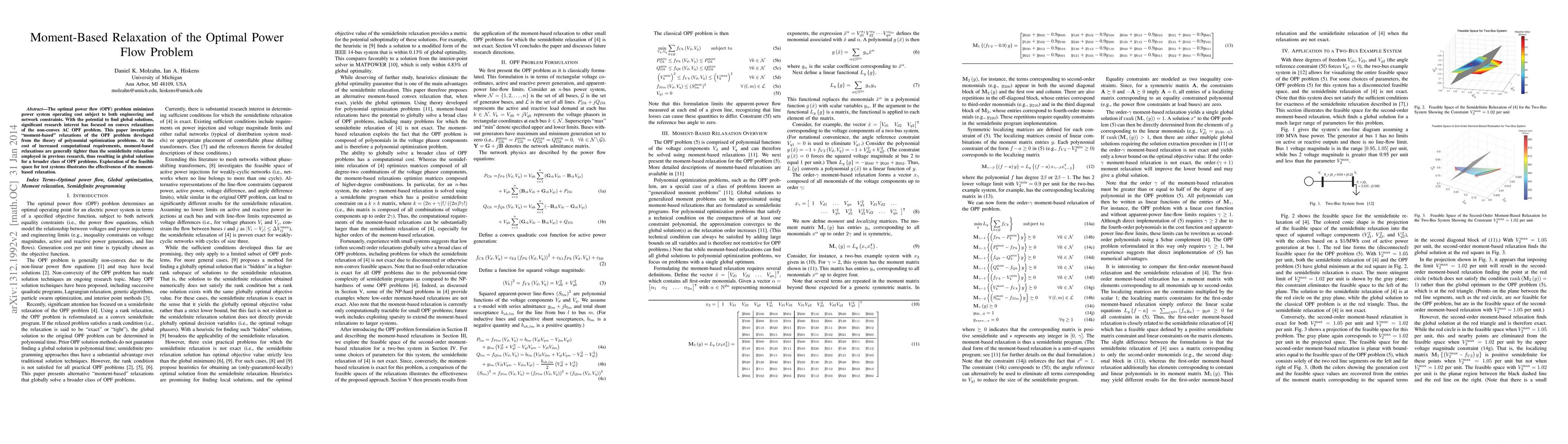 This paper explores "moment-based" relaxations for the optimal power flow problem, leveraging polynomial optimization theory to achieve tighter, more effective global solutions compared to traditional semidefinite relaxations, despite higher computational costs. The method's effectiveness is demonstrated through exploration of feasible spaces in test systems.