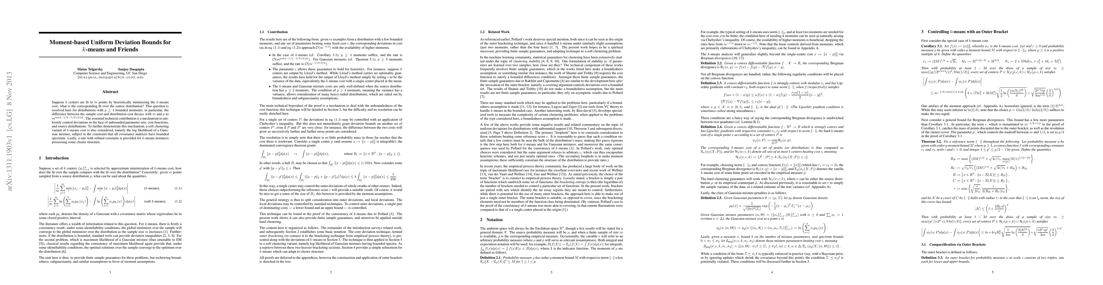 Suppose $k$ centers are fit to $m$ points by heuristically minimizing the $k$-means cost; what is the corresponding fit over the source distribution? This question is resolved here for distributions with $p\geq 4$ bounded moments; in particular, the difference between the sample cost and distribution cost decays with $m$ and $p$ as $m^{\min\{-1/4, -1/2+2/p\}}$. The essential technical contribution is a mechanism to uniformly control deviations in the face of unbounded parameter sets, cost functions, and source distributions. To further demonstrate this mechanism, a soft clustering variant of $k$-means cost is also considered, namely the log likelihood of a Gaussian mixture, subject to the constraint that all covariance matrices have bounded spectrum. Lastly, a rate with refined constants is provided for $k$-means instances possessing some cluster structure.