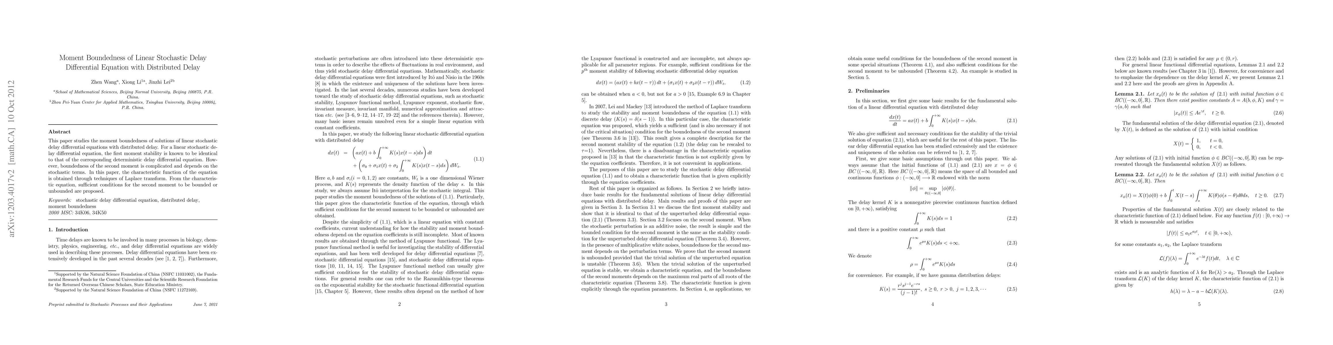 This paper investigates the moment boundedness of solutions for linear stochastic delay differential equations with distributed delay, proposing sufficient conditions for second moment boundedness using Laplace transform techniques and the characteristic function. The study reveals that while first moment stability mirrors deterministic counterparts, second moment boundedness is influenced by stochastic terms.