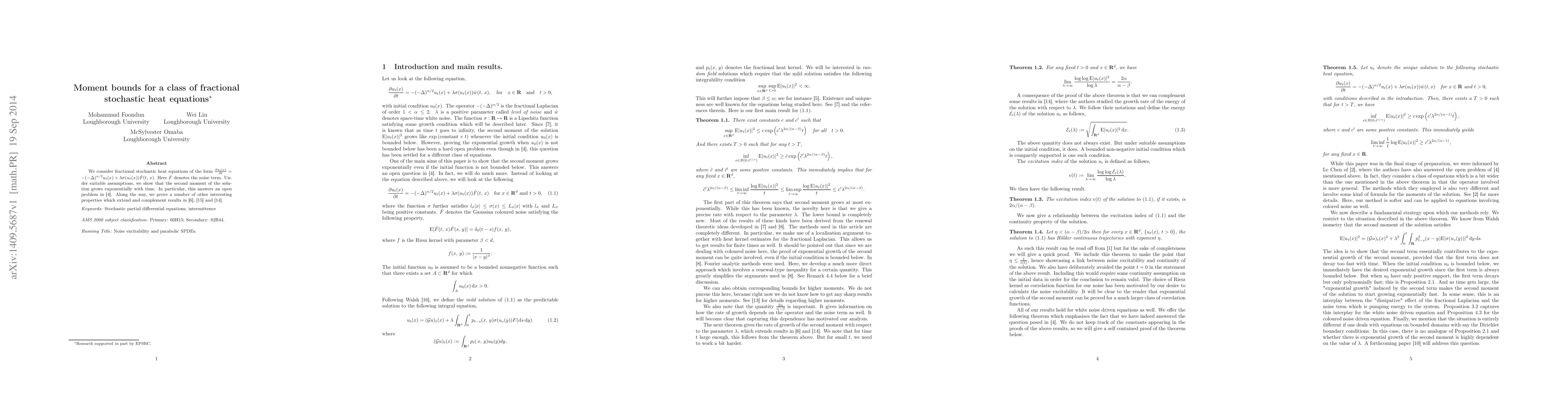 We consider fractional stochastic heat equations of the form $\frac{\partial u_t(x)}{\partial t} = -(-\Delta)^{\alpha/2} u_t(x)+\lambda \sigma (u_t(x)) \dot F(t,\, x)$. Here $\dot F$ denotes the noise term. Under suitable assumptions, we show that the second moment of the solution grows exponentially with time. In particular, this answers an open problem in \cite{CoKh}. Along the way, we prove a number of other interesting properties which extend and complement results in \cite{foonjose}, \cite{Khoshnevisan:2013aa} and \cite{Khoshnevisan:2013ab}.