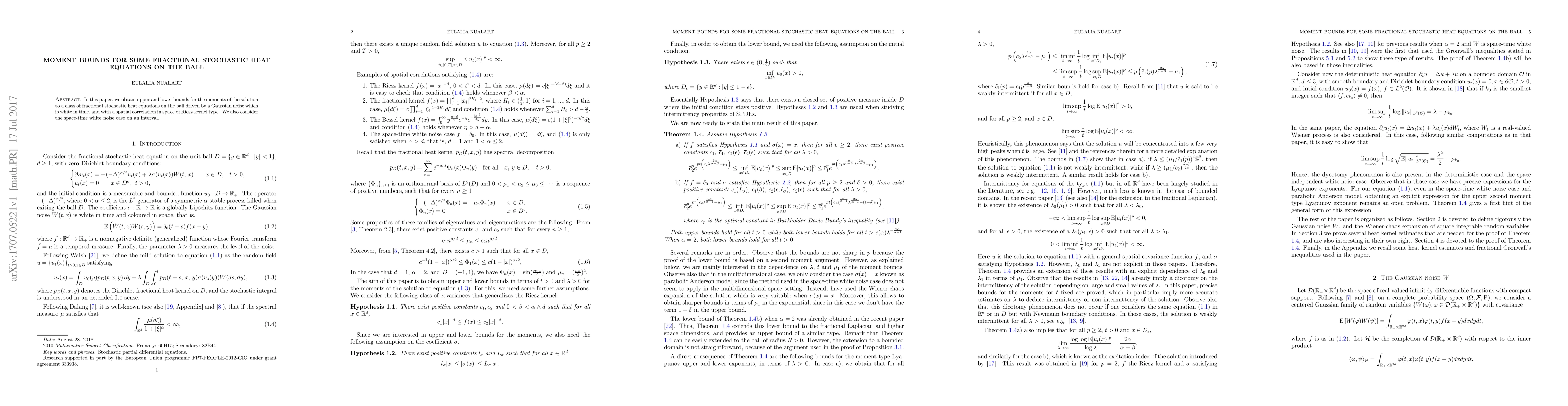 Researchers found upper and lower bounds for moments of solutions to certain fractional stochastic heat equations on a ball, providing insights into their behavior under different noise conditions.