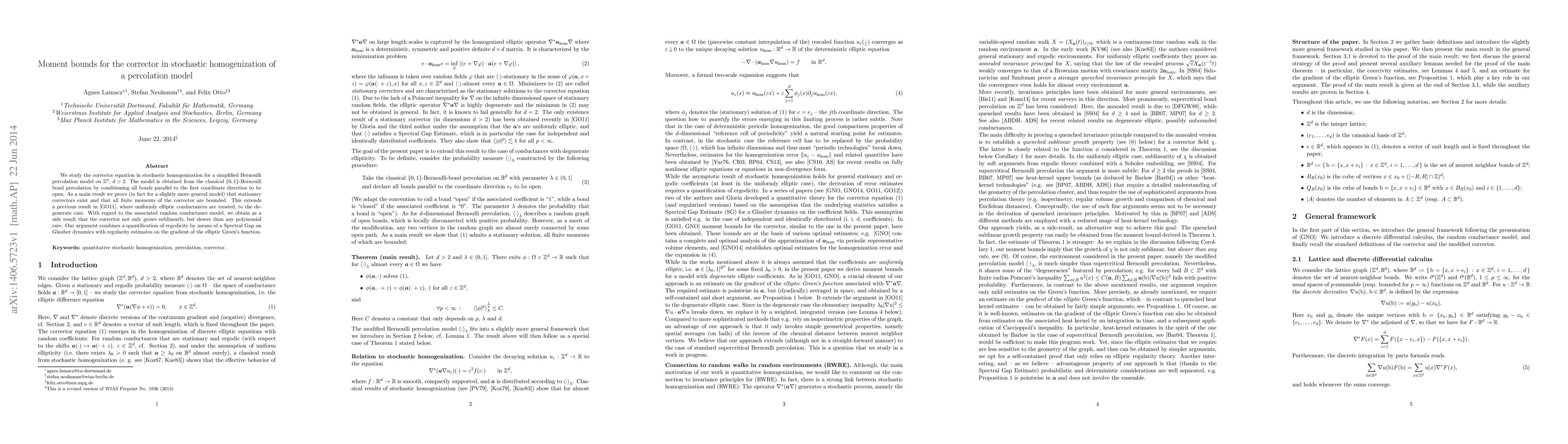 This paper proves the existence of stationary correctors in stochastic homogenization for a simplified Bernoulli percolation model on $\mathbb{Z}^d$ and shows that all finite moments of the corrector are bounded. It extends previous results to a degenerate case and demonstrates that the corrector grows sublinearly, slower than any polynomial rate.