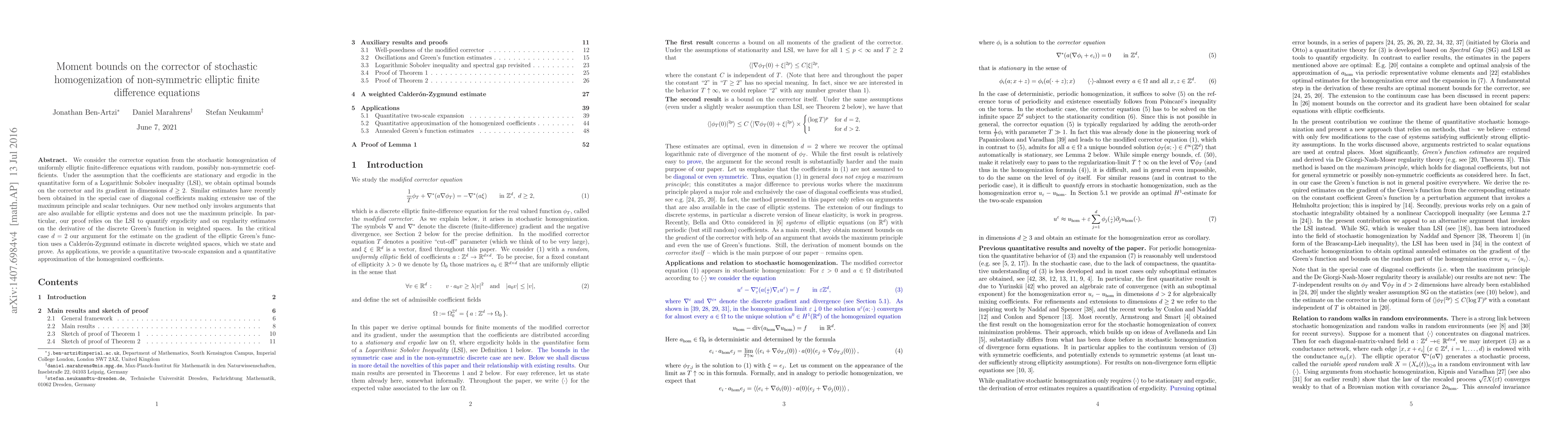We consider the corrector equation from the stochastic homogenization of uniformly elliptic finite-difference equations with random, possibly non-symmetric coefficients. Under the assumption that the coefficients are stationary and ergodic in the quantitative form of a Logarithmic Sobolev inequality (LSI), we obtain optimal bounds on the corrector and its gradient in dimensions $d \geq 2$. Similar estimates have recently been obtained in the special case of diagonal coefficients making extensive use of the maximum principle and scalar techniques. Our new method only invokes arguments that are also available for elliptic systems and does not use the maximum principle. In particular, our proof relies on the LSI to quantify ergodicity and on regularity estimates on the derivative of the discrete Green's function in weighted spaces.