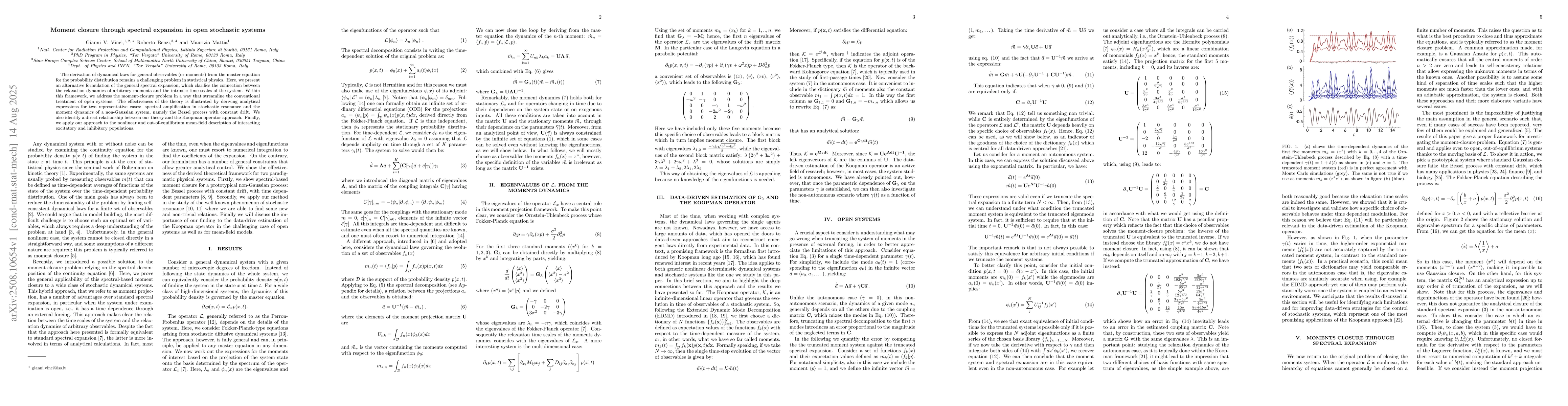The derivation of dynamical laws for general observables (or moments) from the master equation for the probability distribution remains a challenging problem in statistical physics. Here, we present an alternative formulation of the general spectral expansion, which clarifies the connection between the relaxation dynamics of arbitrary moments and the intrinsic time scales of the system. Within this framework, we address the moment-closure problem in a way that streamline the conventional treatment of open systems. The effectiveness of the theory is illustrated by deriving analytical expressions for two representative cases: spectral amplification in stochastic resonance and the moment dynamics of a non-Gaussian system, namely the Bessel process with constant drift. We also identify a direct relationship between our theory and the Koopman operator approach. Finally, we apply our approach to the nonlinear and out-of-equilibrium mean-field description of interacting excitatory and inhibitory populations.