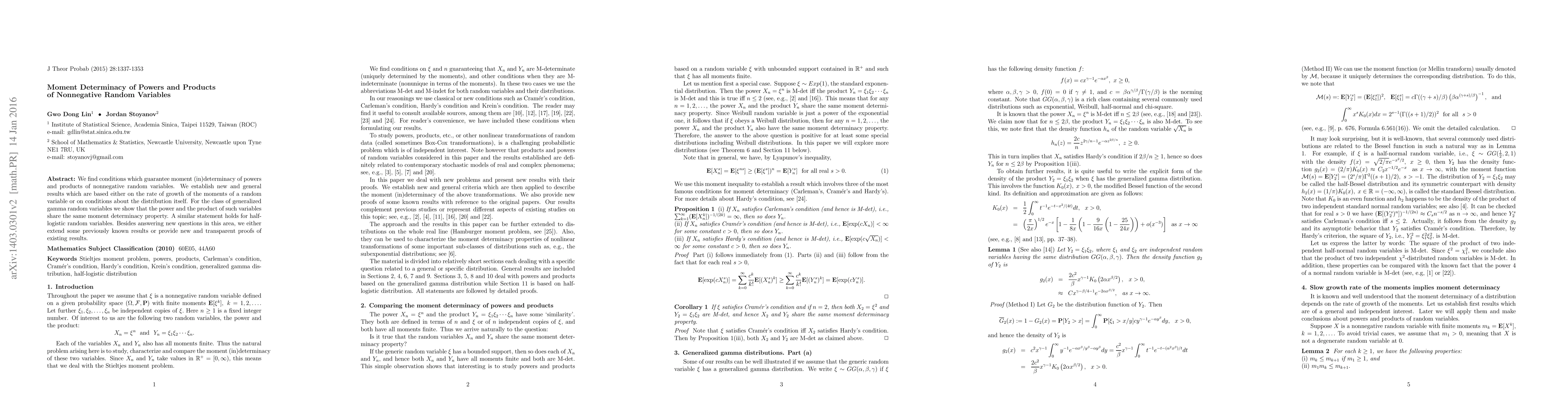 This paper identifies conditions for moment determinacy in powers and products of nonnegative random variables, establishing new results based on moment growth rates or distributional properties. It demonstrates that generalized gamma and half-logistic random variables share identical moment determinacy properties for their powers and products.