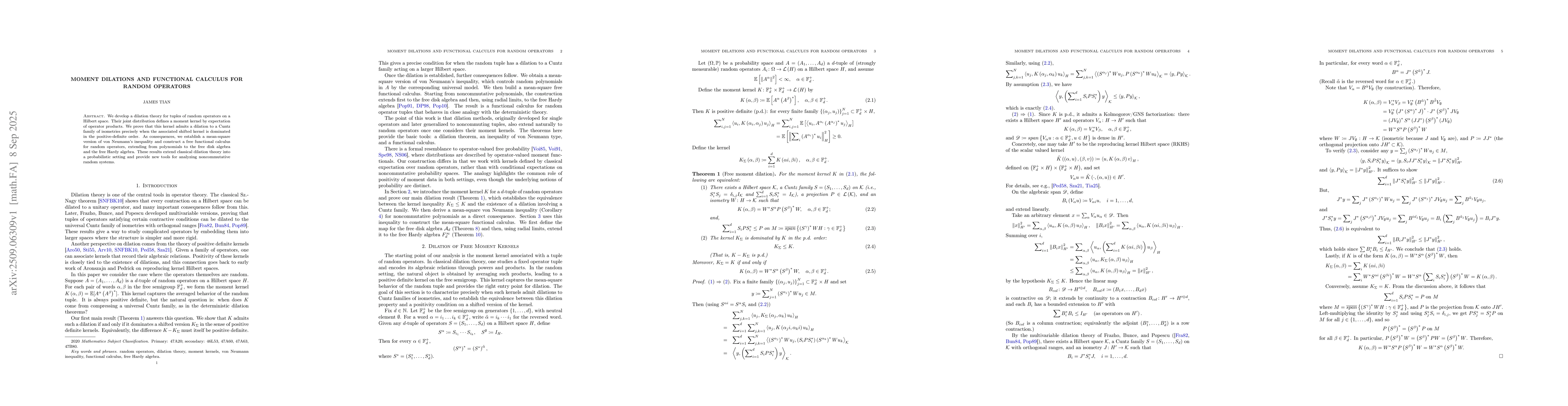 We develop a dilation theory for tuples of random operators on a Hilbert space. Their joint distribution defines a moment kernel by expectation of operator products. We prove that this kernel admits a dilation to a Cuntz family of isometries precisely when the associated shifted kernel is dominated in the positive-definite order. As consequences, we establish a mean-square version of von Neumann's inequality and construct a free functional calculus for random operators, extending from polynomials to the free disk algebra and the free Hardy algebra. These results extend classical dilation theory into a probabilistic setting and provide new tools for analyzing noncommutative random systems.