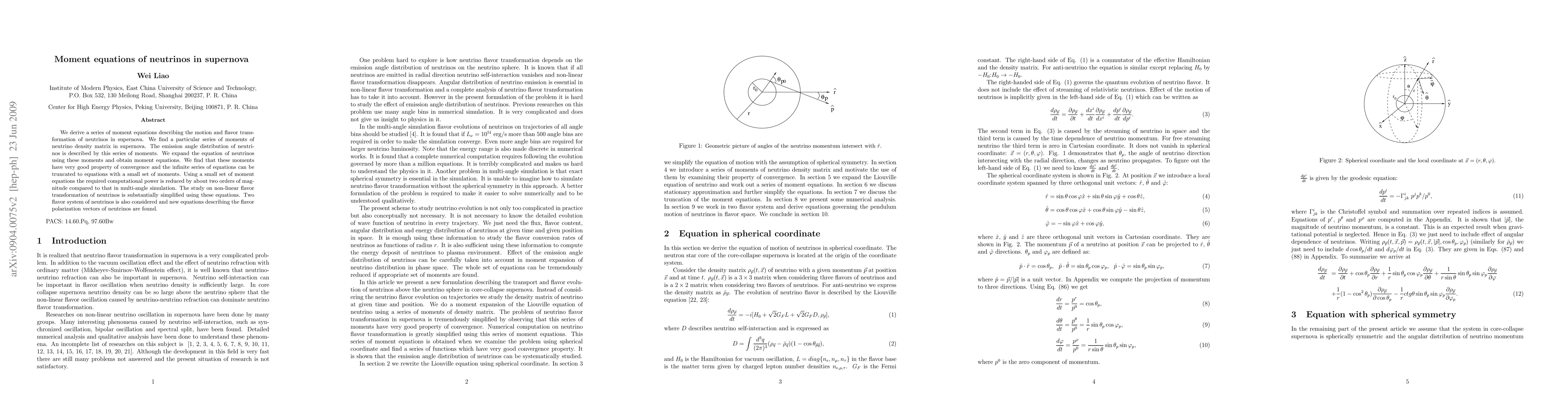 We derive a series of moment equations describing the motion and flavor transformation of neutrinos in supernova. We find a particular series of moments of neutrino density matrix in supernova. The emission angle distribution of neutrinos is described by this series of moments. We expand the equation of neutrinos using these moments and obtain moment equations. We find that these moments have very good property of convergence and the infinite series of equations can be truncated to equations with a small set of moments. Using a small set of moment equations the required computational power is reduced by about two orders of magnitude compared to that in multi-angle simulation. The study on non-linear flavor transformation of neutrinos is substantially simplified using these equations. Two flavor system of neutrinos is also considered and new equations describing the flavor polarization vectors of neutrinos are found.