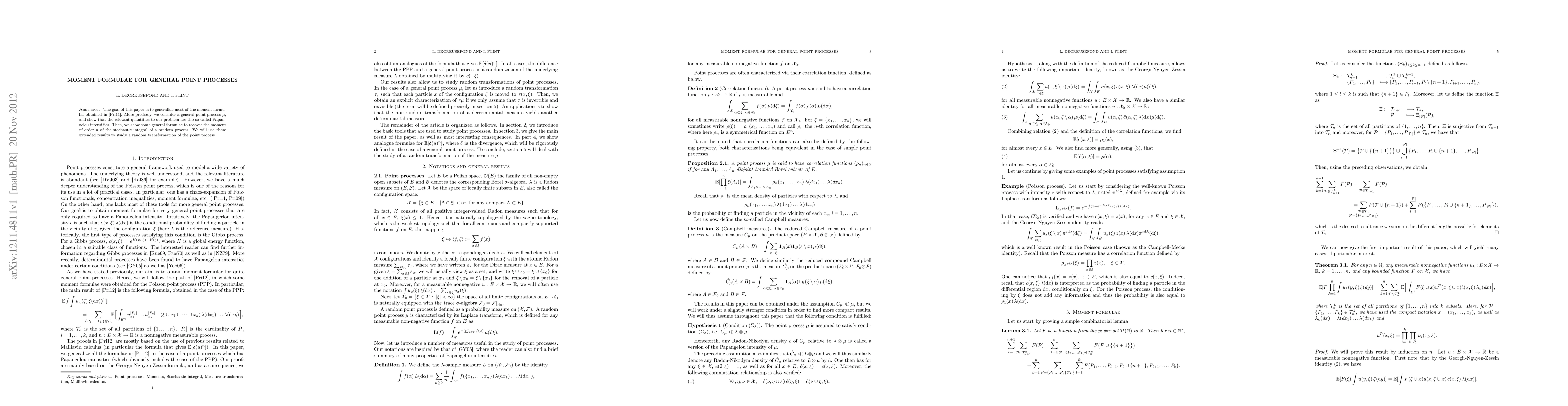 The paper generalizes moment formulae for point processes using Papangelou intensities, extending results from [Pri11] to recover moments of stochastic integrals of random processes, and applying these to study a random transformation of the point process.