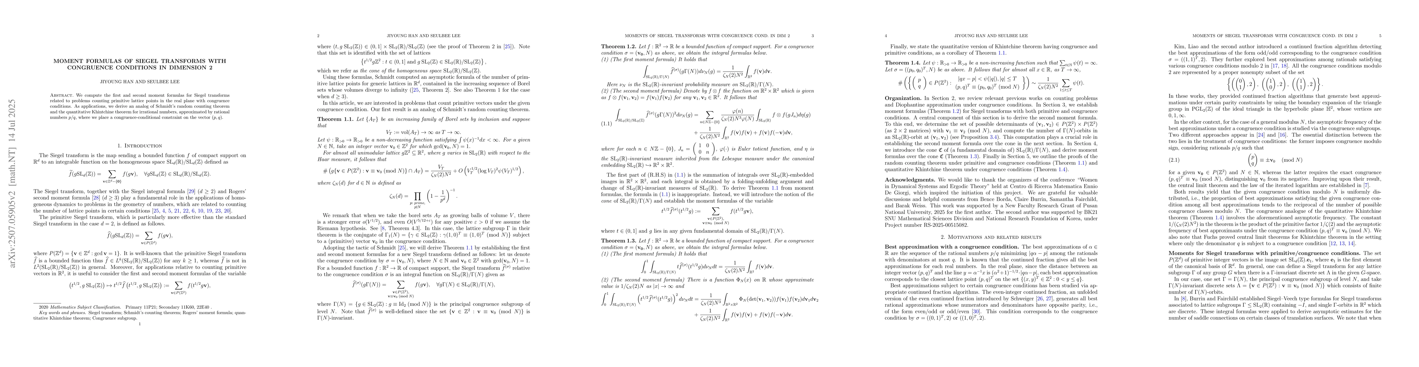 We compute the first and second moment formulas for Siegel transforms related to problems counting primitive lattice points in the real plane with congruence conditions. As applications, we derive an analog of Schmidt's random counting theorem and the quantitative Khintchine theorem for irrational numbers, approximated by rational numbers $p/q$, where we place a congruence-conditional constraint on the vector $(p,q)$.