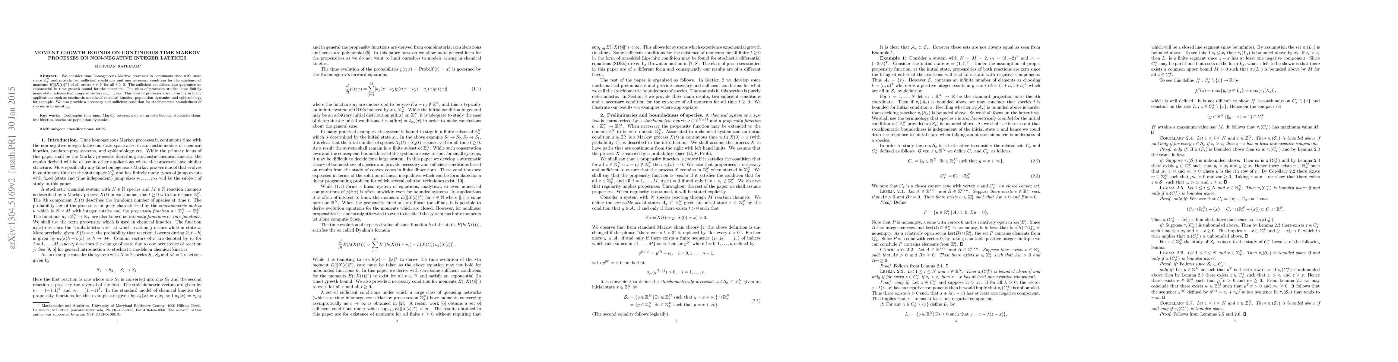 We consider Markov processes in continuous time with state space $\posint^N$ and provide two sufficient conditions and one necessary condition for the existence of moments $E(\|X(t)\|^r)$ of all orders $r \in \nat$ for all $t \geq 0$. The sufficient conditions also guarantee an exponential in time growth bound for the moments. The class of processes studied have finitely many state independent jumpsize vectors $\nu_1,\dots,\nu_M$. This class of processes arise naturally in many applications such as stochastic models of chemical kinetics, population dynamics and queueing theory for example. We also provide a necessary and sufficient condition for stochiometric boundedness of species in terms of $\nu_j$.