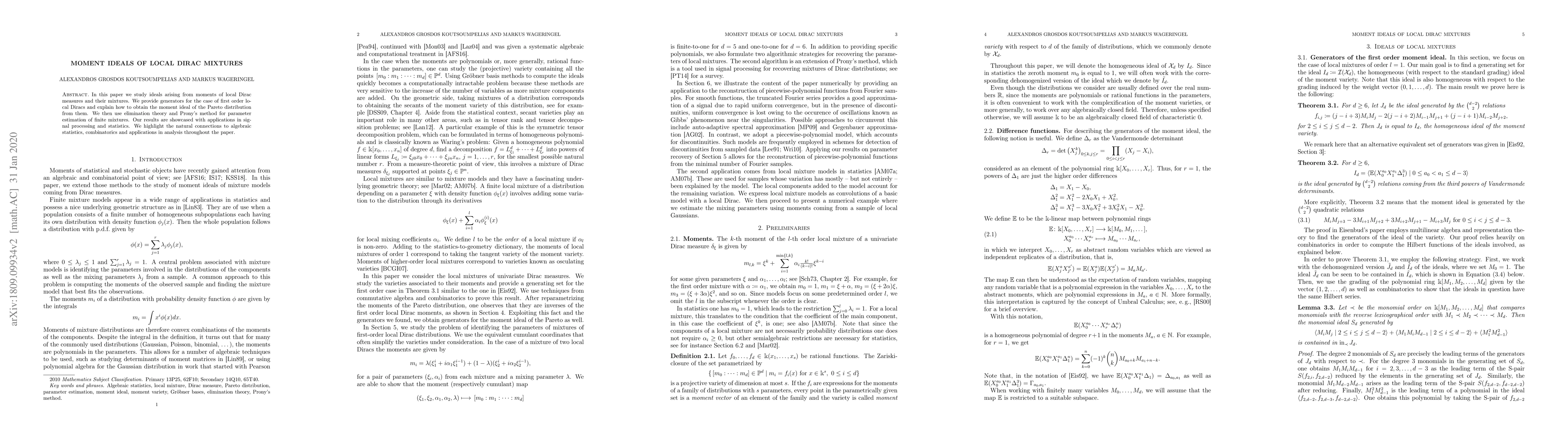 In this paper we study ideals arising from moments of local Dirac measures and their mixtures. We provide generators for the case of first order local Diracs and explain how to obtain the moment ideal of the Pareto distribution from them. We then use elimination theory and Prony's method for parameter estimation of finite mixtures. Our results are showcased with applications in signal processing and statistics. We highlight the natural connections to algebraic statistics, combinatorics and applications in analysis throughout the paper.