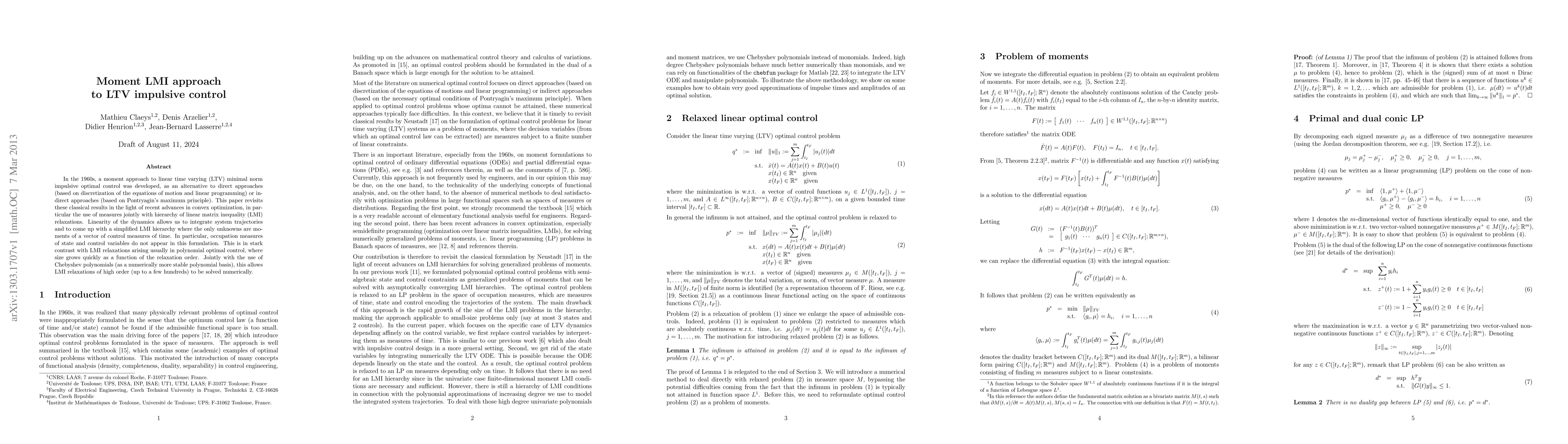 In the 1960s, a moment approach to linear time varying (LTV) minimal norm impulsive optimal control was developed, as an alternative to direct approaches (based on discretization of the equations of motion and linear programming) or indirect approaches (based on Pontryagin's maximum principle). This paper revisits these classical results in the light of recent advances in convex optimization, in particular the use of measures jointly with hierarchy of linear matrix inequality (LMI) relaxations. Linearity of the dynamics allows us to integrate system trajectories and to come up with a simplified LMI hierarchy where the only unknowns are moments of a vector of control measures of time. In particular, occupation measures of state and control variables do not appear in this formulation. This is in stark contrast with LMI relaxations arising usually in polynomial optimal control, where size grows quickly as a function of the relaxation order. Jointly with the use of Chebyshev polynomials (as a numerically more stable polynomial basis), this allows LMI relaxations of high order (up to a few hundreds) to be solved numerically.
