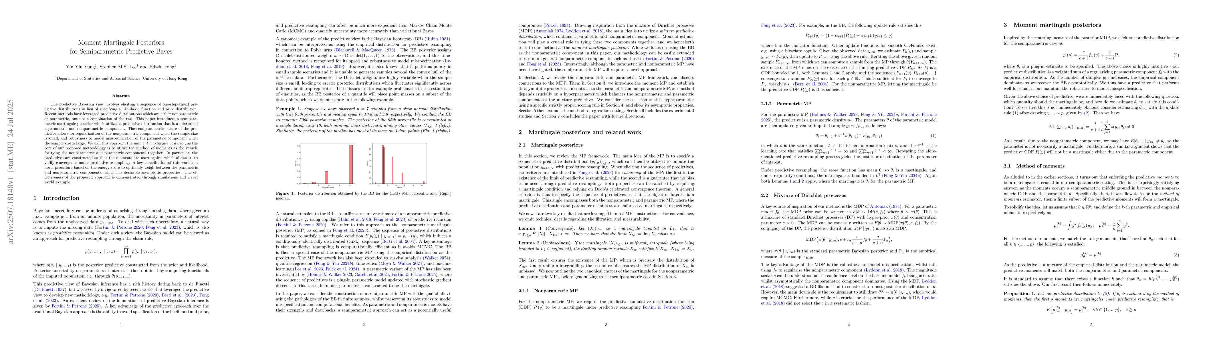 The predictive Bayesian view involves eliciting a sequence of one-step-ahead predictive distributions in lieu of specifying a likelihood function and prior distribution. Recent methods have leveraged predictive distributions which are either nonparametric or parametric, but not a combination of the two. This paper introduces a semiparametric martingale posterior which utilizes a predictive distribution that is a mixture of a parametric and nonparametric component. The semiparametric nature of the predictive allows for regularization of the nonparametric component when the sample size is small, and robustness to model misspecification of the parametric component when the sample size is large. We call this approach the moment martingale posterior, as the core of our proposed methodology is to utilize the method of moments as the vehicle for tying the nonparametric and parametric components together. In particular, the predictives are constructed so that the moments are martingales, which allows us to verify convergence under predictive resampling. A key contribution of this work is a novel procedure based on the energy score to optimally weigh between the parametric and nonparametric components, which has desirable asymptotic properties. The effectiveness of the proposed approach is demonstrated through simulations and a real world example.