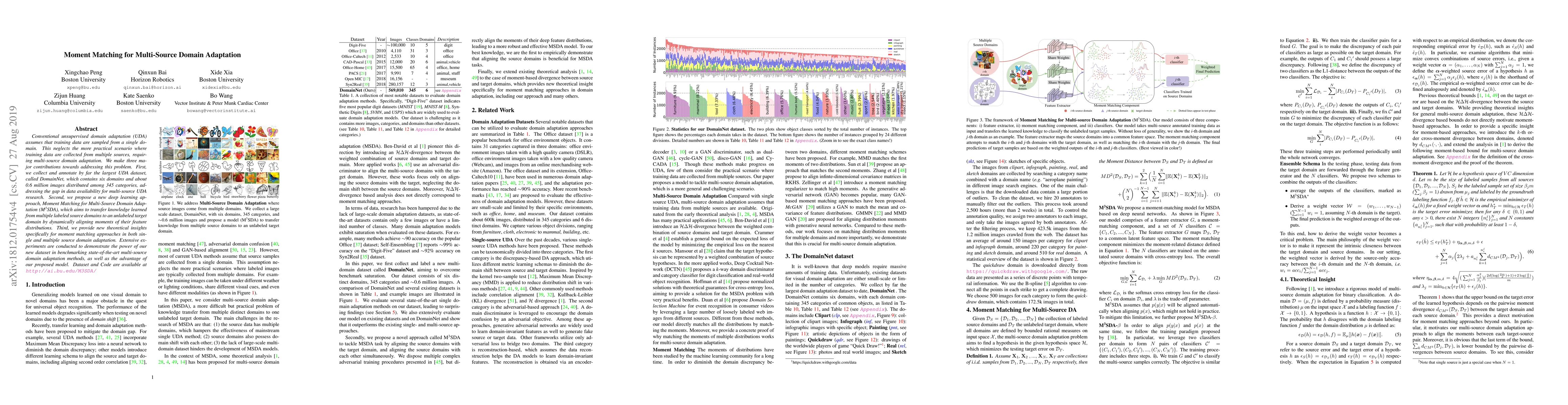 This paper introduces a new dataset, DomainNet, for multi-source unsupervised domain adaptation, and proposes a novel deep learning method, Moment Matching for Multi-Source Domain Adaptation (M3SDA), which aligns feature distribution moments across multiple source domains to an unlabeled target domain. The study also provides theoretical insights into moment matching techniques.