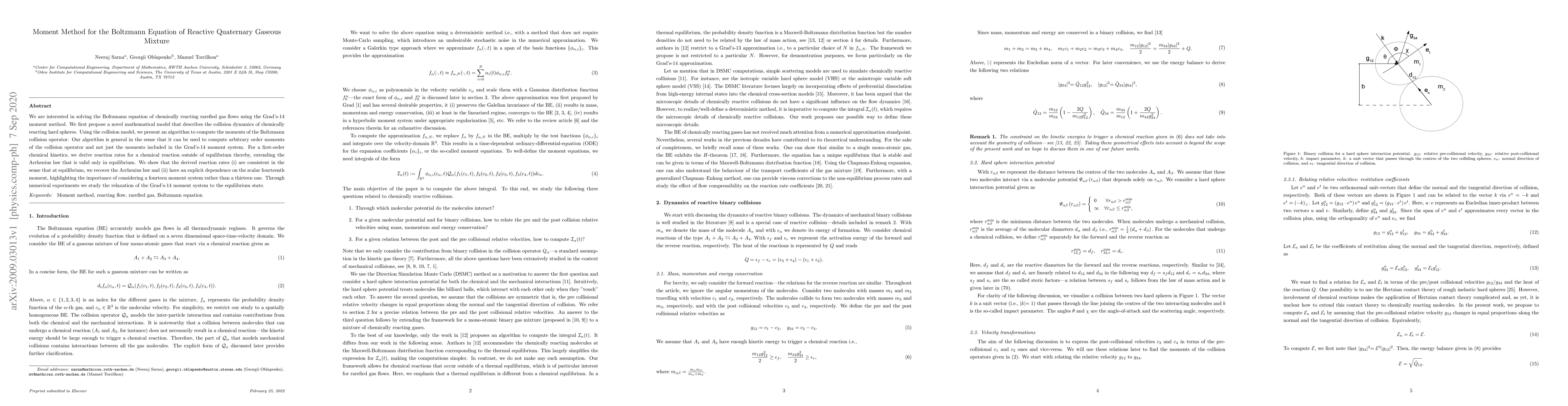 We are interested in solving the Boltzmann equation of chemically reacting rarefied gas flows using the Grad's-14 moment method. We first propose a novel mathematical model that describes the collision dynamics of chemically reacting hard spheres. Using the collision model, we present an algorithm to compute the moments of the Boltzmann collision operator. Our algorithm is general in the sense that it can be used to compute arbitrary order moments of the collision operator and not just the moments included in the Grad's-14 moment system. For a first-order chemical kinetics, we derive reaction rates for a chemical reaction outside of equilibrium thereby, extending the Arrhenius law that is valid only in equilibrium. We show that the derived reaction rates (i) are consistent in the sense that at equilibrium, we recover the Arrhenius law and (ii) have an explicit dependence on the scalar fourteenth moment, highlighting the importance of considering a fourteen moment system rather than a thirteen one. Through numerical experiments we study the relaxation of the Grad's-14 moment system to the equilibrium state.