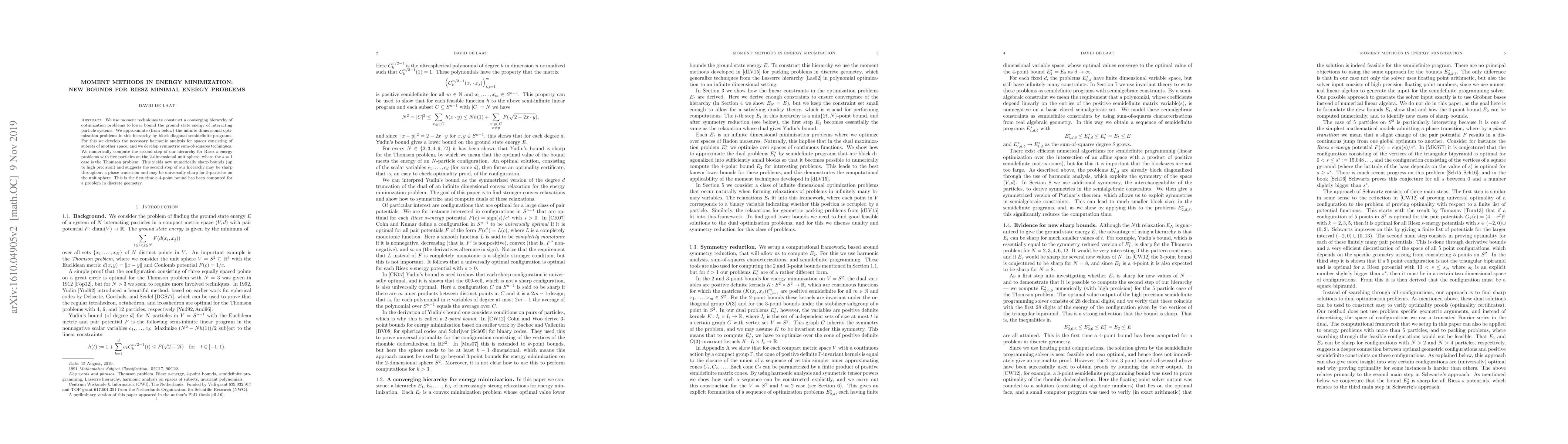 We use moment techniques to construct a converging hierarchy of optimization problems to lower bound the ground state energy of interacting particle systems. We approximate (from below) the infinite dimensional optimization problems in this hierarchy by block diagonal semidefinite programs. For this we develop the necessary harmonic analysis for spaces consisting of subsets of another space, and we develop symmetric sum-of-squares techniques. We numerically compute the second step of our hierarchy for Riesz s-energy problems with five particles on the 2-dimensional unit sphere, where the s=1 case is the Thomson problem. This yields new numerically sharp bounds (up to high precision) and suggests the second step of our hierarchy may be sharp throughout a phase transition and may be universally sharp for 5-particles on the unit sphere. This is the first time a 4-point bound has been computed for a problem in discrete geometry.