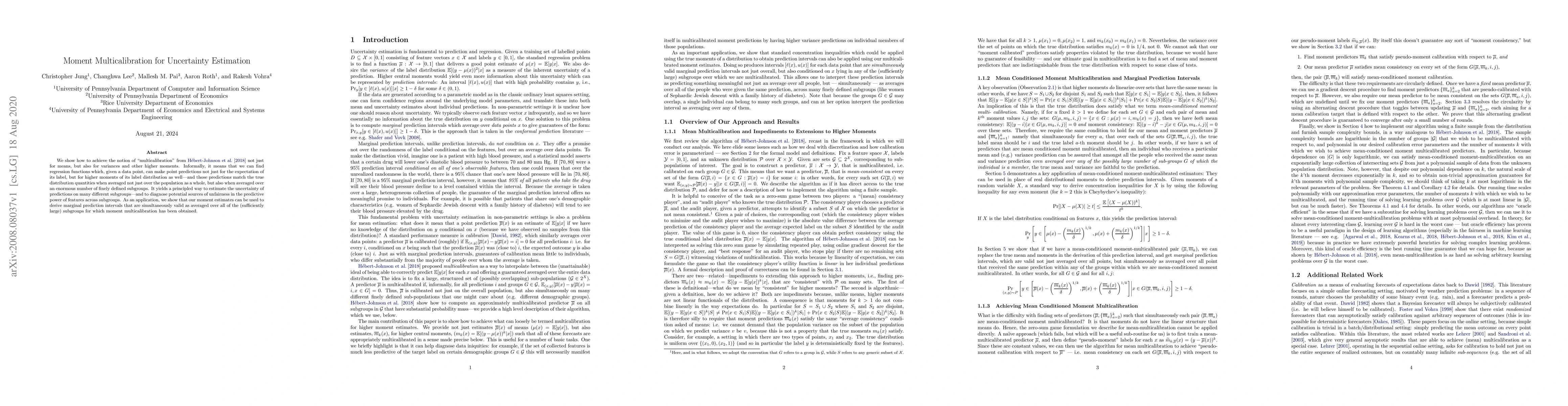 This paper introduces "moment multicalibration" to predict not just the mean but also variances and higher moments of label distributions, enabling uncertainty estimation across numerous subgroups. It provides a method to diagnose feature-based unfairness and derives valid marginal prediction intervals.