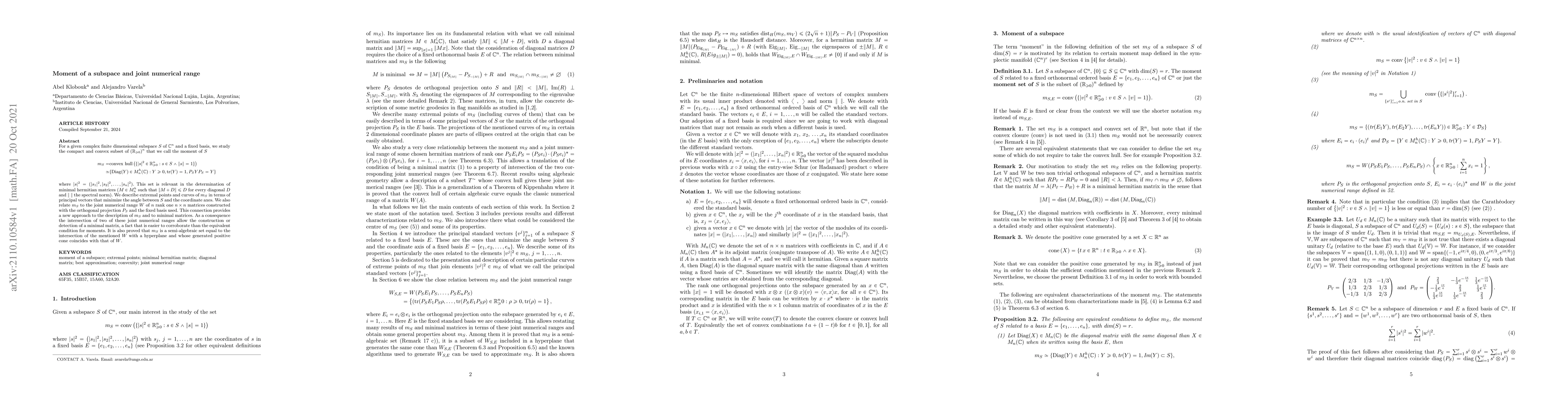 Researchers study the 'moment' of a complex subspace in terms of its convex set of moments, linking it to minimal hermitian matrices and joint numerical ranges.