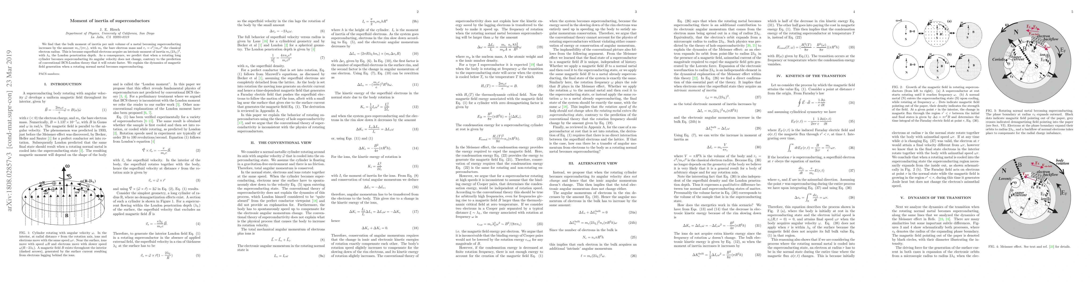 We find that the bulk moment of inertia per unit volume of a metal becoming superconducting increases by the amount $m_e/(\pi r_c)$, with $m_e$ the bare electron mass and $r_c=e^2/m_e c^2$ the classical electron radius. This is because superfluid electrons acquire an intrinsic moment of inertia $m_e (2\lambda_L)^2$, with $\lambda_L$ the London penetration depth. As a consequence, we predict that when a rotating long cylinder becomes superconducting its angular velocity does not change, contrary to the prediction of conventional BCS-London theory that it will rotate faster. We explain the dynamics of magnetic field generation when a rotating normal metal becomes superconducting.