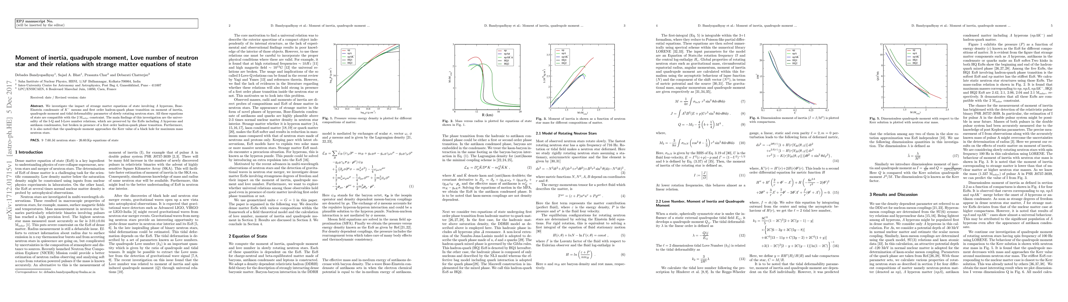 We investigate the impact of strange matter equations of state involving $\Lambda$ hyperons, Bose-Einstein condensate of $K^-$ mesons and first order hadron-quark phase transition on moment of inertia, quadrupole moment and tidal deformability parameter of slowly rotating neutron stars. All these equations of state are compatible with the 2 M$_{solar}$ constraint. The main findings of this investigation are the universality of the I-Q and I-Love number relations, which are preserved by the EoSs including $\Lambda$ hyperons and antikaon condensates, but broken in presence of a first order hadron-quark phase transition. Furthermore, it is also noted that the quadrupole moment approaches the Kerr value of a black hole for maximum mass neutron stars.