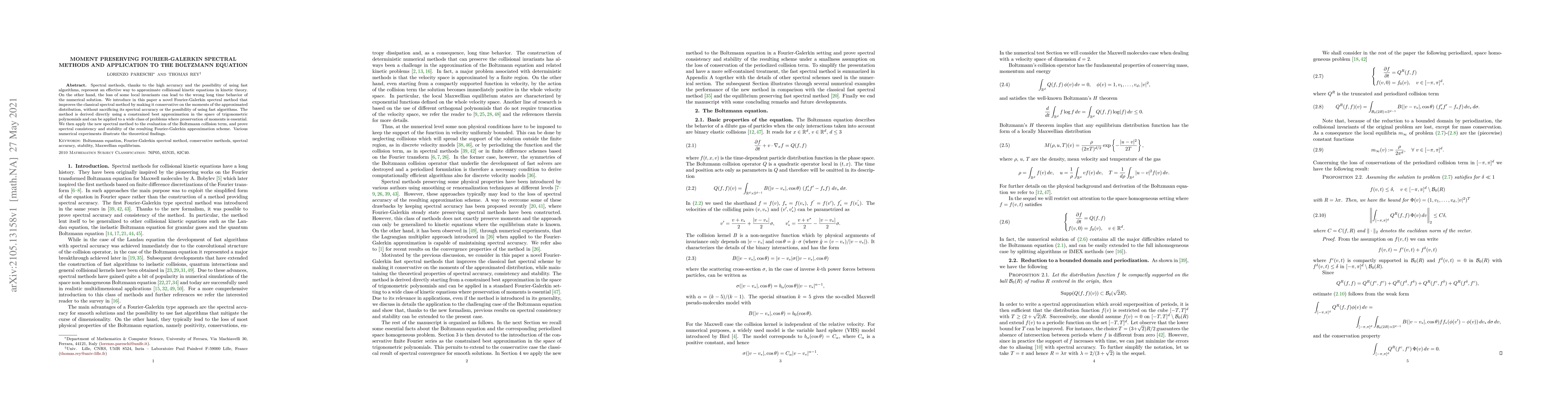 A new Fourier-Galerkin spectral method preserves moments in kinetic equations, maintaining spectral accuracy while avoiding long time behavior errors. It's applied to the Boltzmann equation, demonstrating consistency and stability.
