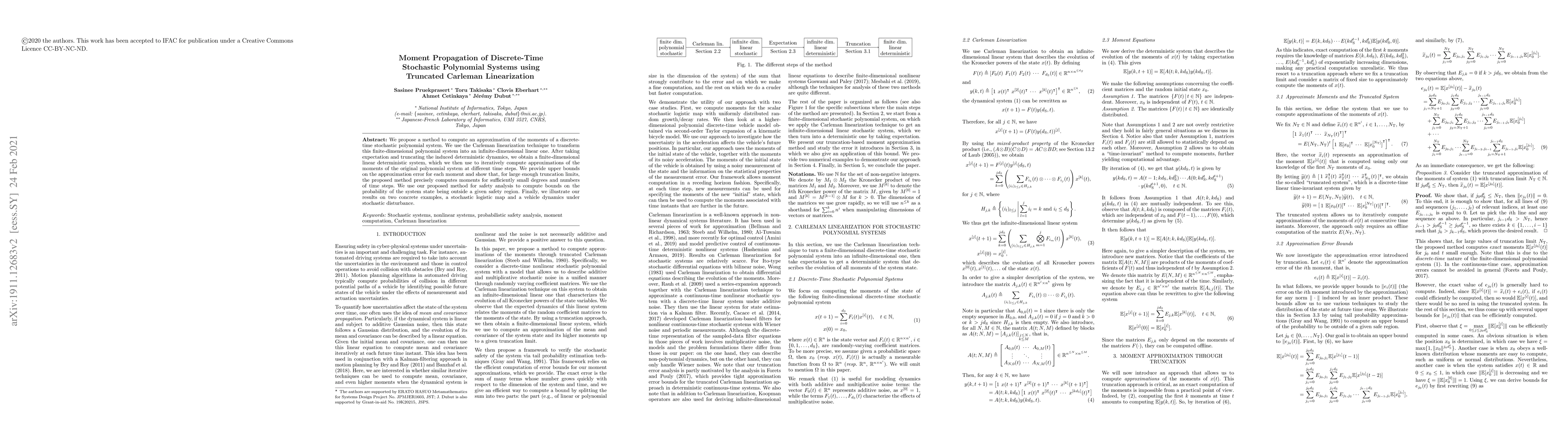 We propose a method to compute an approximation of the moments of a discrete-time stochastic polynomial system. We use the Carleman linearization technique to transform this finite-dimensional polynomial system into an infinite-dimensional linear one. After taking expectation and truncating the induced deterministic dynamics, we obtain a finite-dimensional linear deterministic system, which we then use to iteratively compute approximations of the moments of the original polynomial system at different time steps. We provide upper bounds on the approximation error for each moment and show that, for large enough truncation limits, the proposed method precisely computes moments for sufficiently small degrees and numbers of time steps. We use our proposed method for safety analysis to compute bounds on the probability of the system state being outside a given safety region. Finally, we illustrate our results on two concrete examples, a stochastic logistic map and a vehicle dynamics under stochastic disturbance.