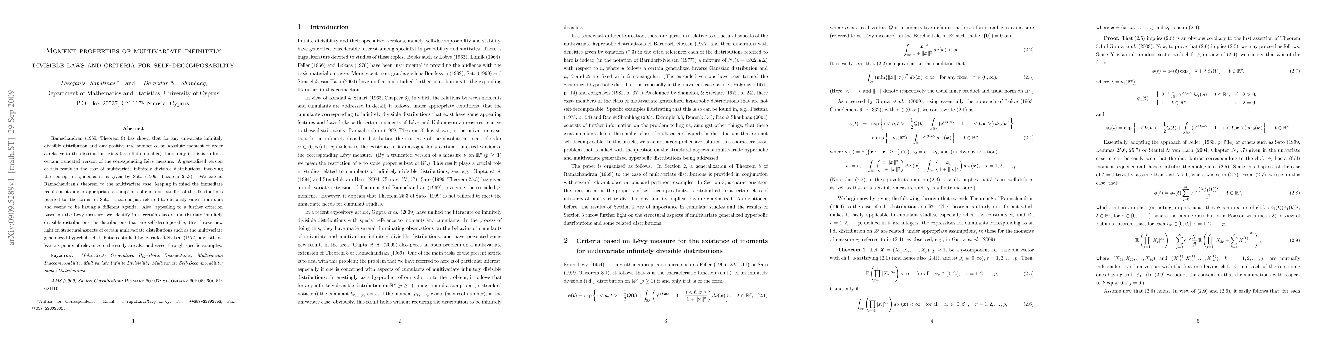 Ramachandran (1969, Theorem 8) has shown that for any univariate infinitely divisible distribution and any positive real number $\alpha$, an absolute moment of order $\alpha$ relative to the distribution exists (as a finite number) if and only if this is so for a certain truncated version of the corresponding L$\acute{\rm e}$vy measure. A generalized version of this result in the case of multivariate infinitely divisible distributions, involving the concept of g-moments, is given by Sato (1999, Theorem 25.3). We extend Ramachandran's theorem to the multivariate case, keeping in mind the immediate requirements under appropriate assumptions of cumulant studies of the distributions referred to; the format of Sato's theorem just referred to obviously varies from ours and seems to be having a different agenda. Also, appealing to a further criterion based on the L$\acute{\rm e}$vy measure, we identify in a certain class of multivariate infinitely divisible distributions the distributions that are self-decomposable; this throws new light on structural aspects of certain multivariate distributions such as the multivariate generalized hyperbolic distributions studied by Barndorff-Nielsen (1977) and others. Various points of relevance to the study are also addressed through specific examples.