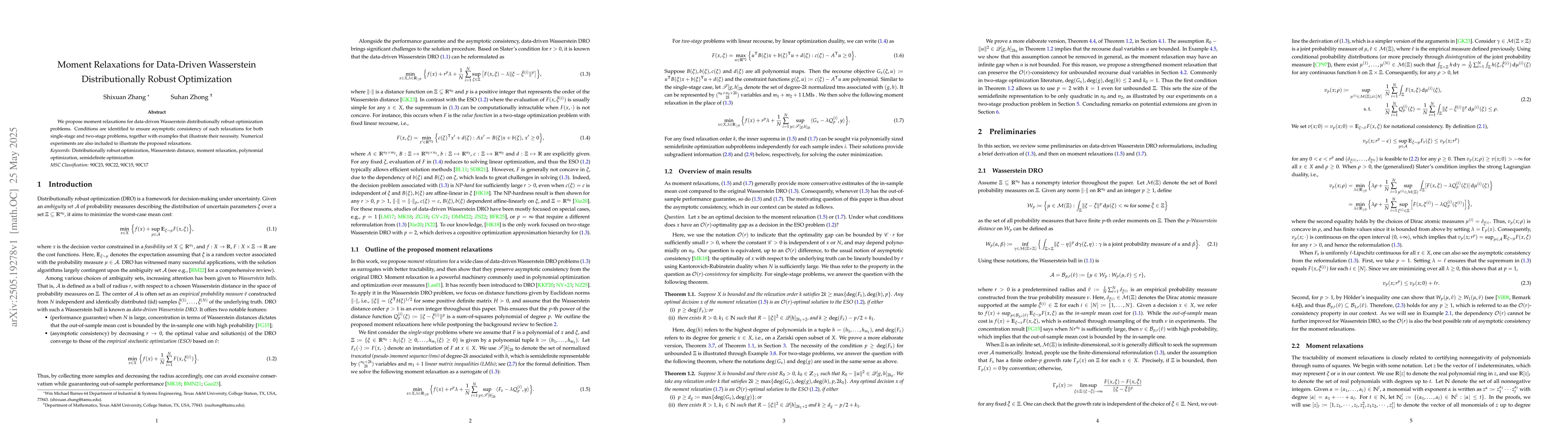 The paper proposes moment relaxations for data-driven Wasserstein distributionally robust optimization problems, identifying conditions for asymptotic consistency in both single-stage and two-stage problems with illustrative examples.