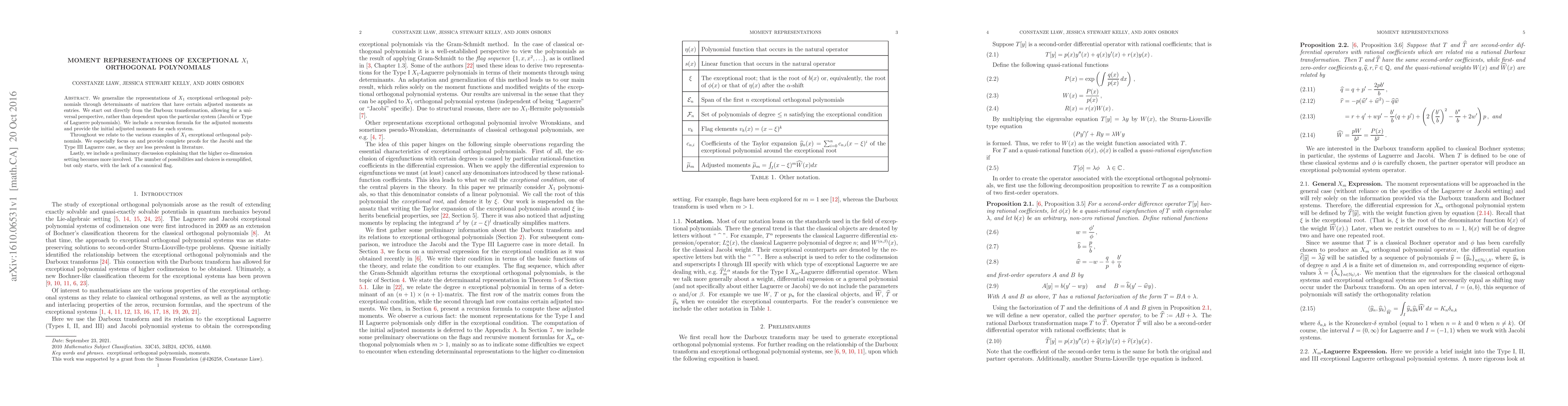 We obtain representations of $X_1$ exceptional orthogonal polynomials through determinants of matrices that have certain adjusted moments as entries. We start out directly from the Darboux transformation, allowing for a universal perspective, rather than dependent upon the particular system (Jacobi or Type of Laguerre polynomials). We include a recursion formula for the adjusted moments and provide the initial adjusted moments for each system. Throughout we relate to the various examples of $X_1$ exceptional orthogonal polynomials. We especially focus on and provide complete proofs for the Jacobi and the Type III Laguerre case, as they are less prevalent in literature. Lastly, we include a preliminary discussion explaining that the higher co-dimension setting becomes more involved. The number of possibilities and choices is exemplified, but only starts, with the lack of a canonical flag.