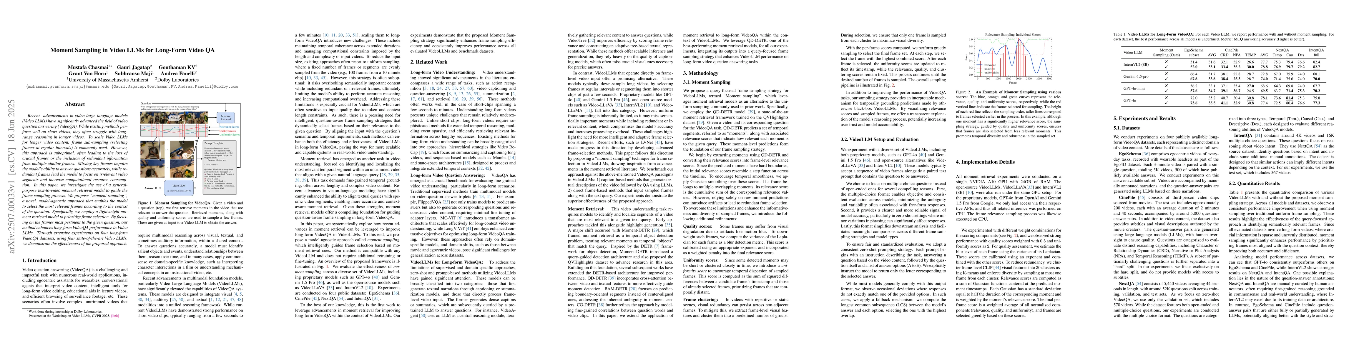 This paper introduces 'moment sampling', a novel method for optimizing frame selection in long-form video question answering using Video LLMs. By employing a lightweight moment retrieval model, it prioritizes relevant frames, enhancing VideoQA performance and reducing computational resource consumption.